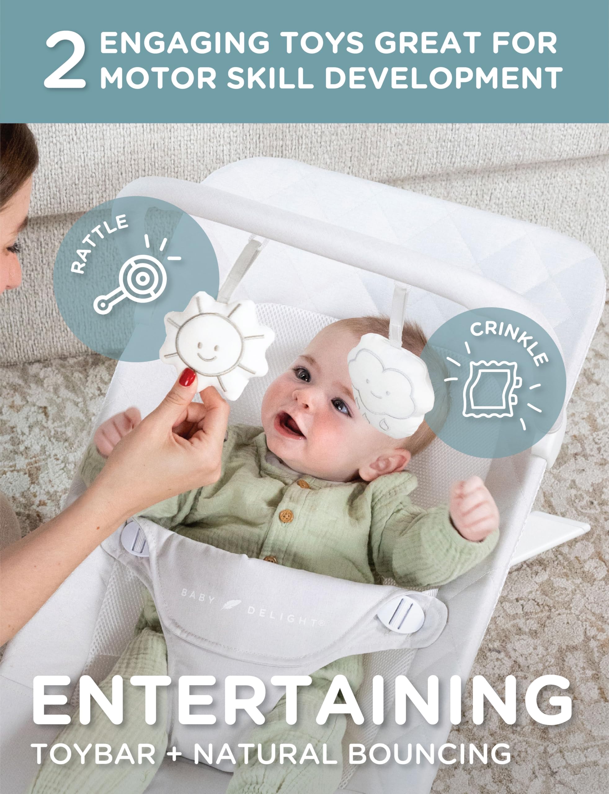 FUN FOR EVERYONE: This baby bouncer seat includes a removable toy bar featuring premium plush, removable toys, with crinkle paper and a rattle, to support baby's physical and cognitive development.