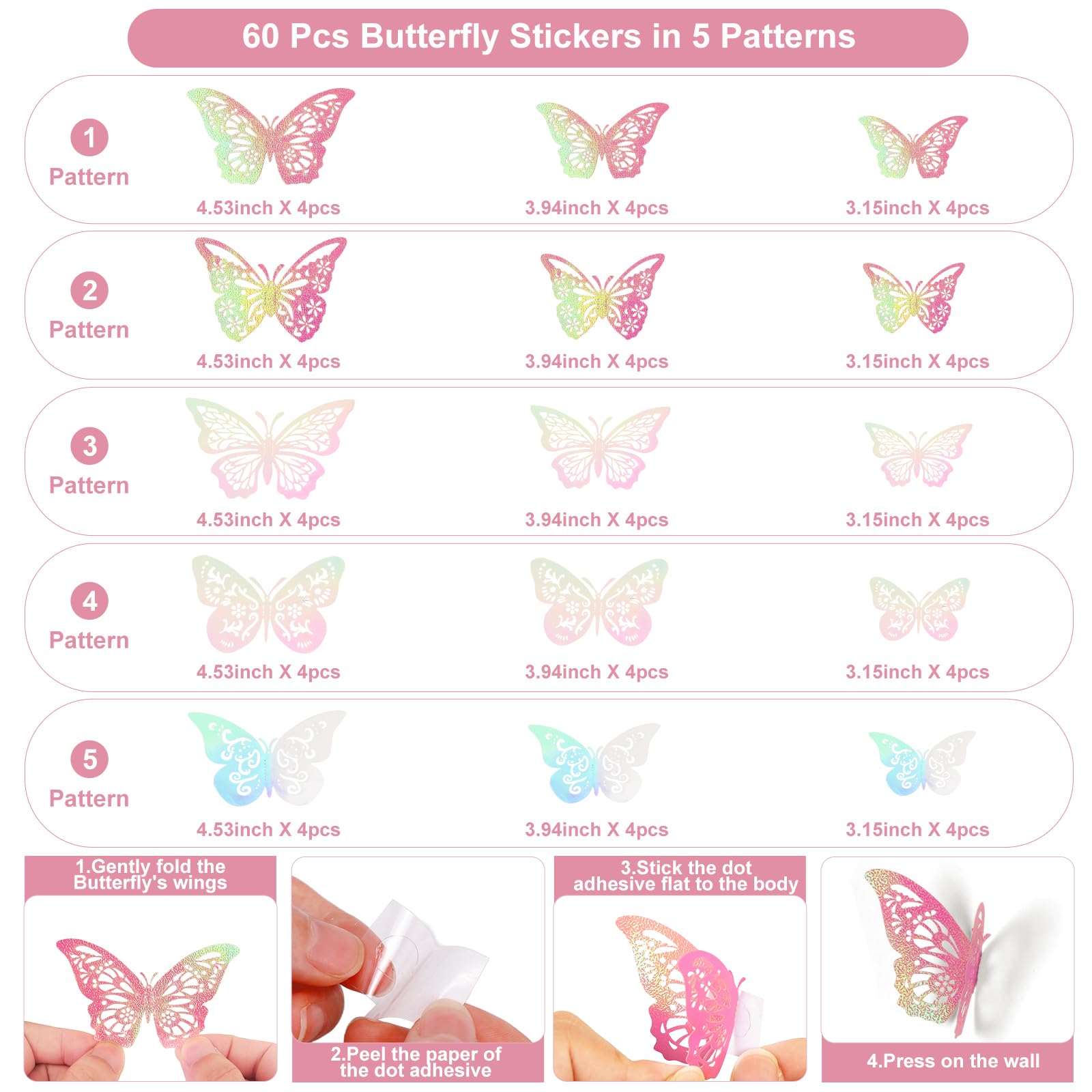 What You Will Receive - You will get 60 pcs butterflies wall stickers, each coming with double-sided glue dots. 12 pcs pattern 1, 12 pcs pattern 2, 12 pcs pattern 3, 12 pcs pattern 4 and 12 pcs pattern 5, each pattern has 3 sizes (3.15", 3.94", 4.53").