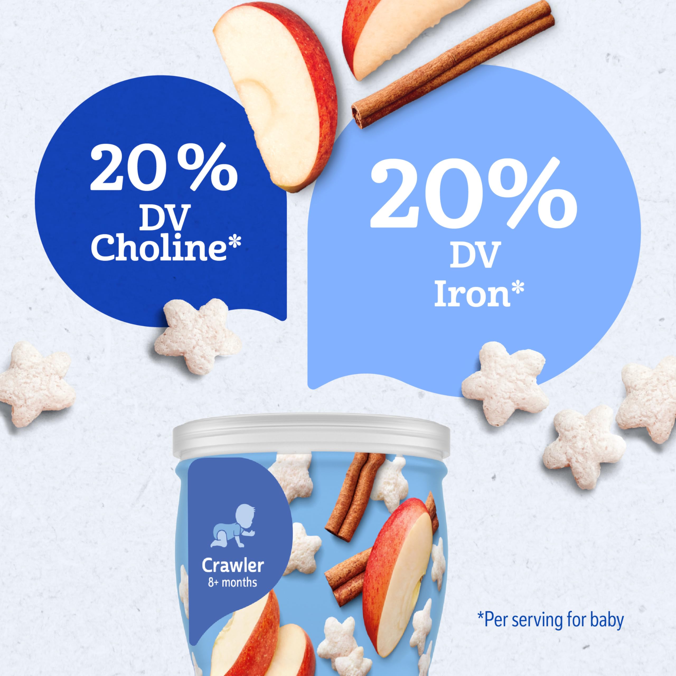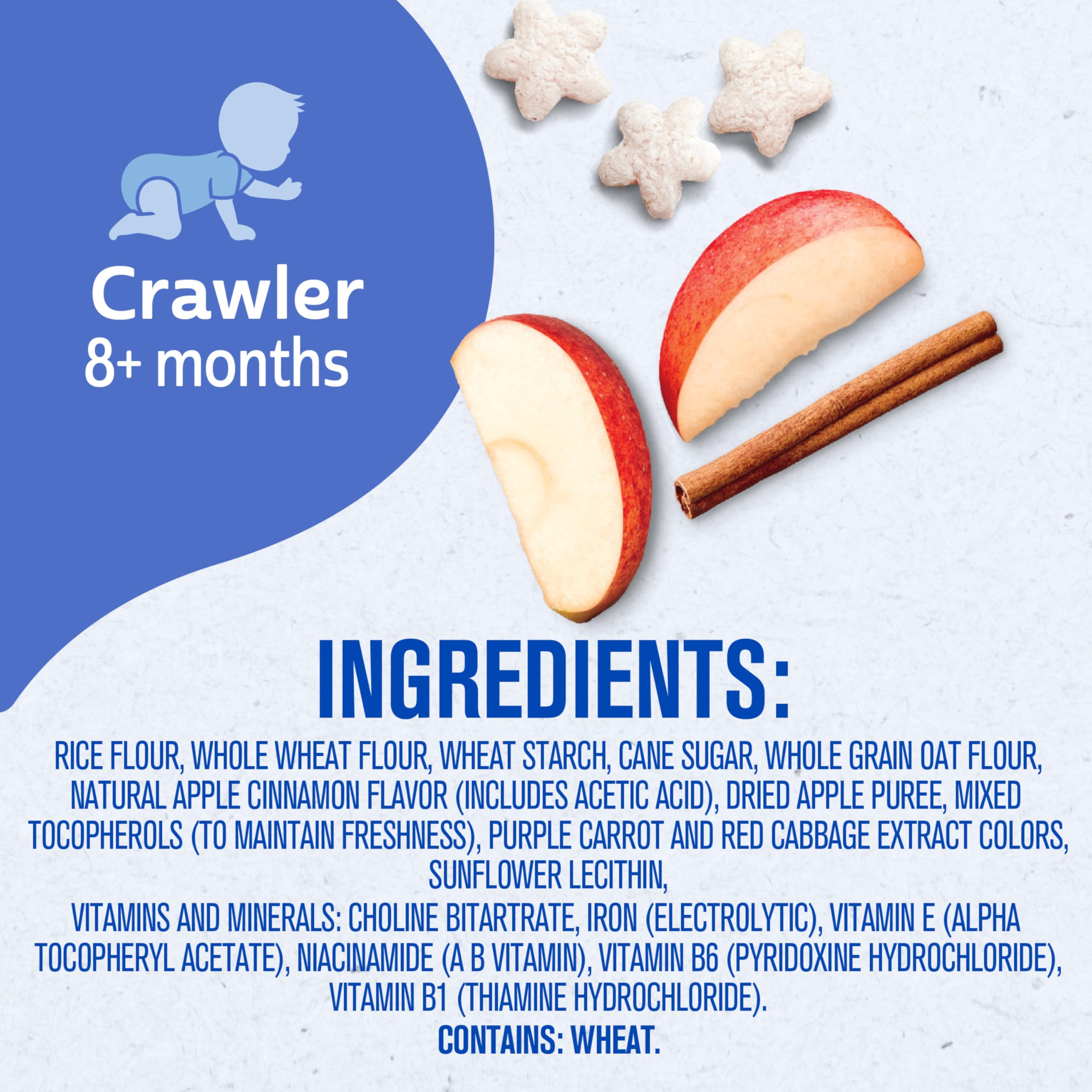 Gerber apple cinnamon baby snacks are made with wholesome ingredients and strict quality standards just for babies. This baby finger food dissolves easily and is perfect for little hands learning to pick things up, while also encouraging self-feeding and independence. Specially crafted to delight your little one, these apple cinnamon puffs are a stage 3 baby food and have been designed for babies 8 months and older. Gerber understands the importance of providing nutritious food as your baby grows and develops. That’s why our dedication to quality and nutrition has been and always will be our highest priority. We're committed to being your partner in parenthood with strict quality standards, nutritious food & expert guidance. Gerber apple cinnamon baby food puffs are a trusted choice for countless families.