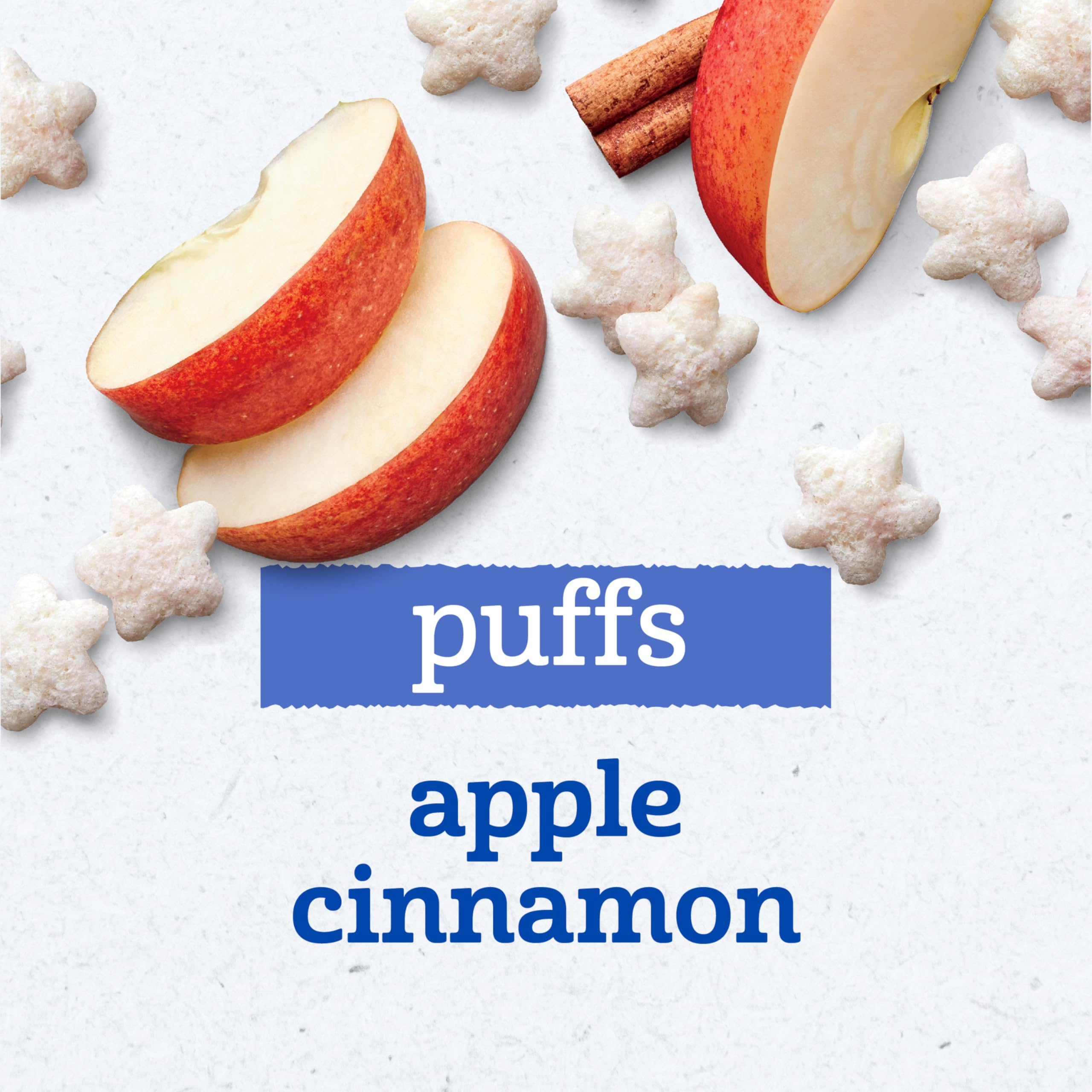 STAGE 3: Gerber apple cinnamon puffs are a stage 3 baby food made for babies 8 months and older. Your little one may be ready for these baby puffs if they crawl without their tummy on the floor, start using their fingers to eat, or start using their jaw to mash food