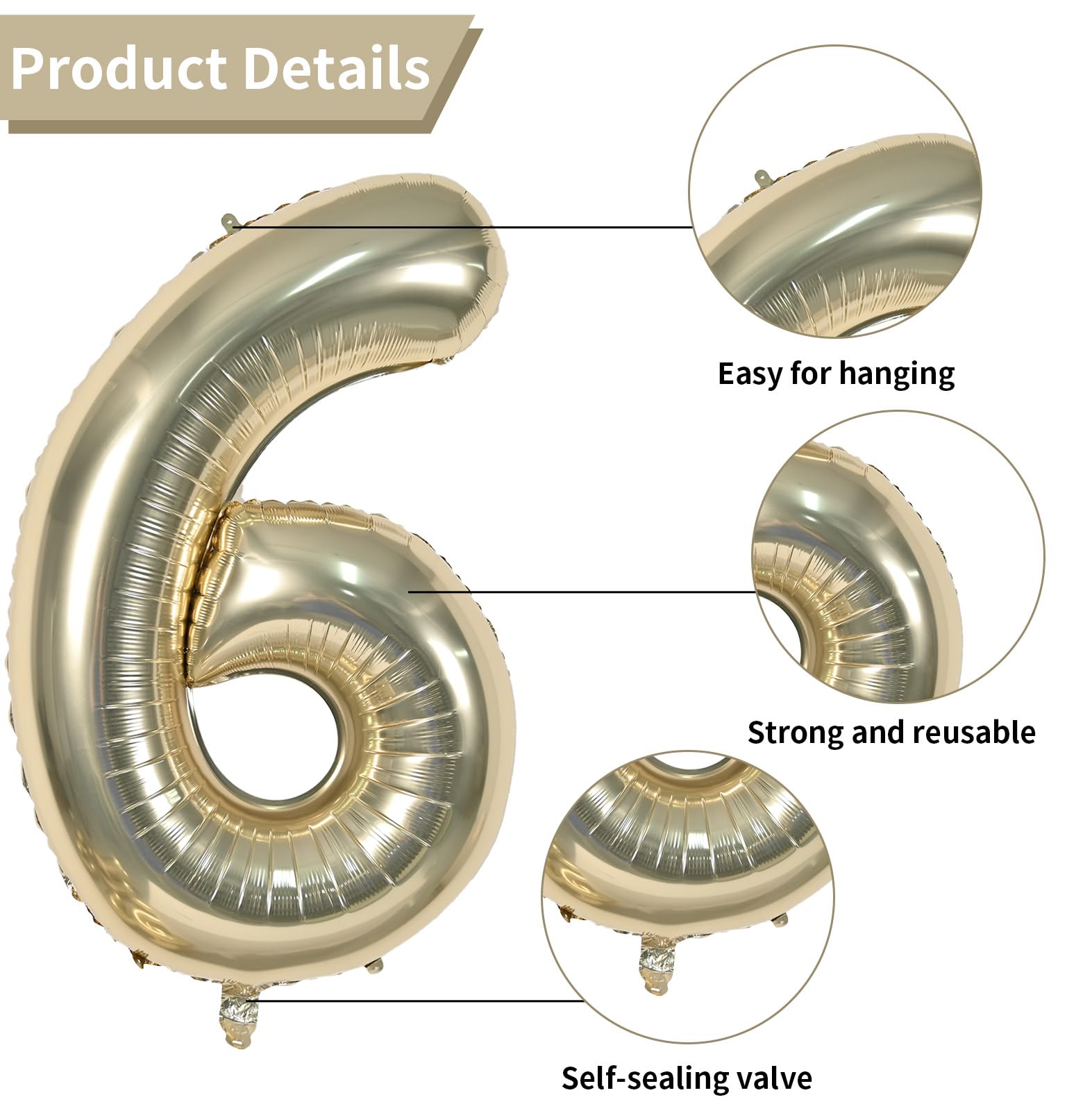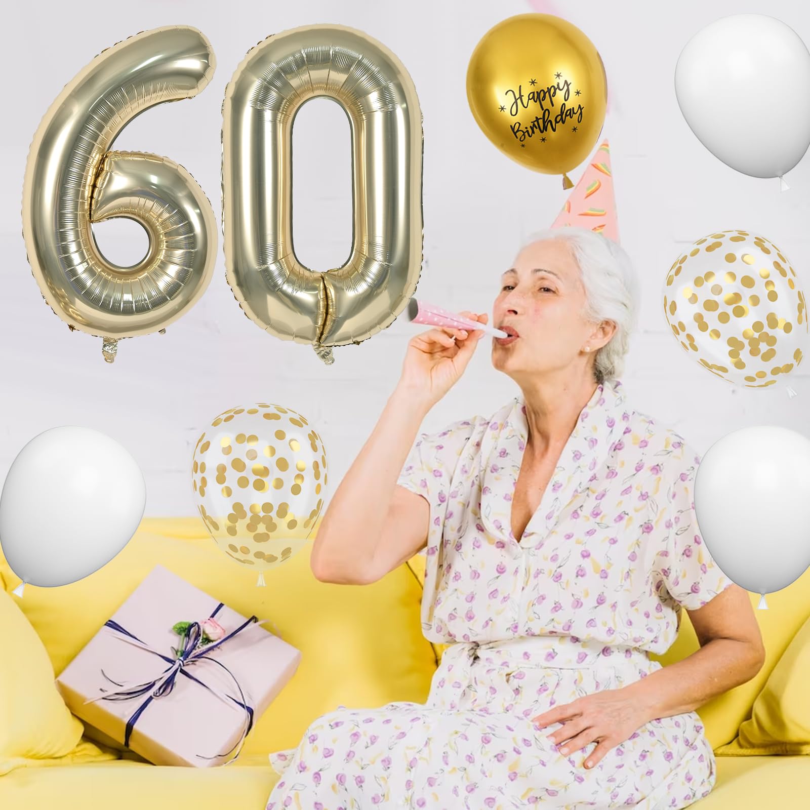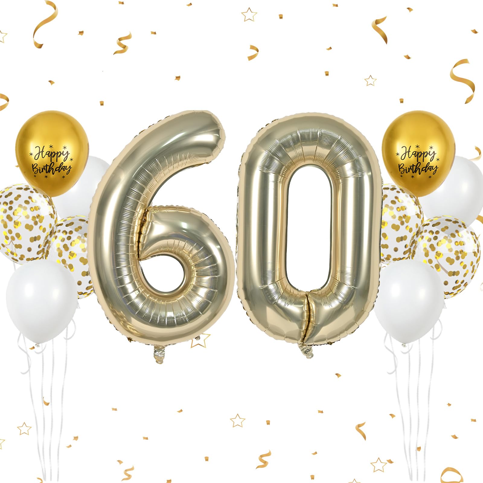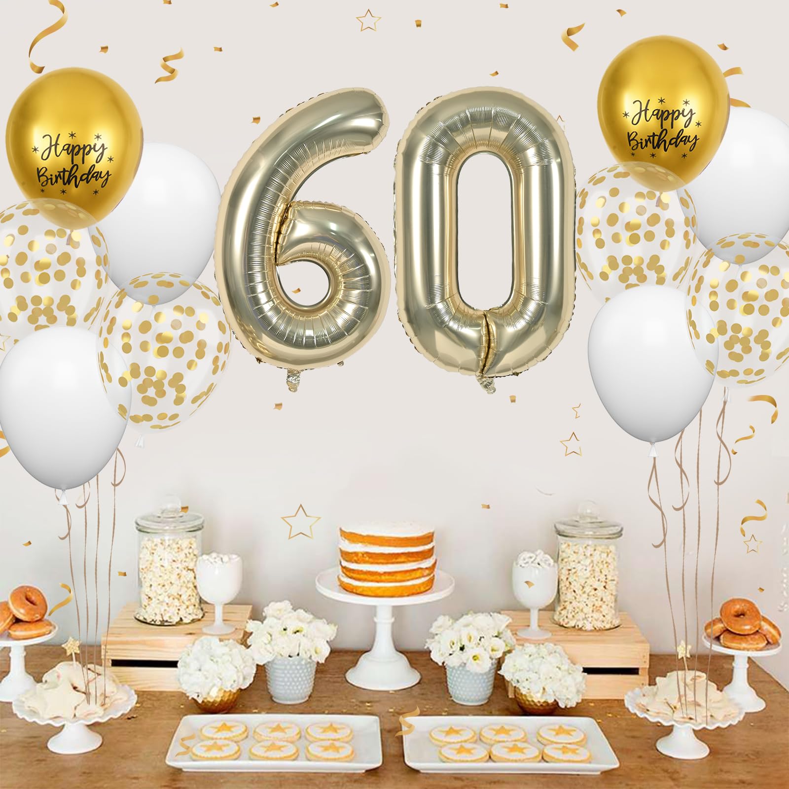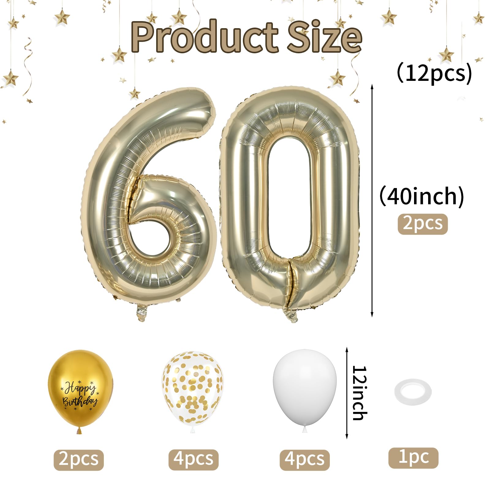 Product Contents: This 60th birthday balloons set includes 2 pcs 40 inch light gold number balloons, 4 pcs 12 inch gold confetti balloons, 4 pcs 12 inch white balloons, 2 pcs 12 inch metallic gold happy birthday print balloons, and 1 pc 32 feet of ribbon