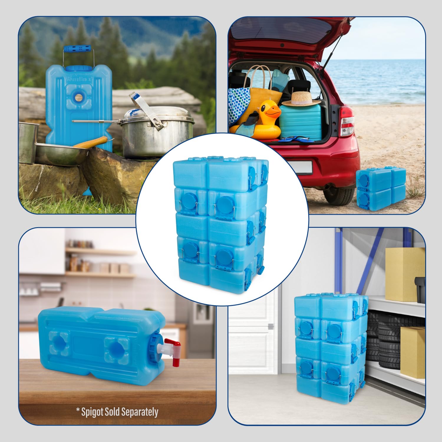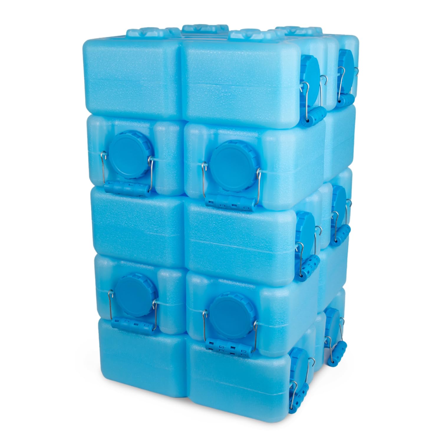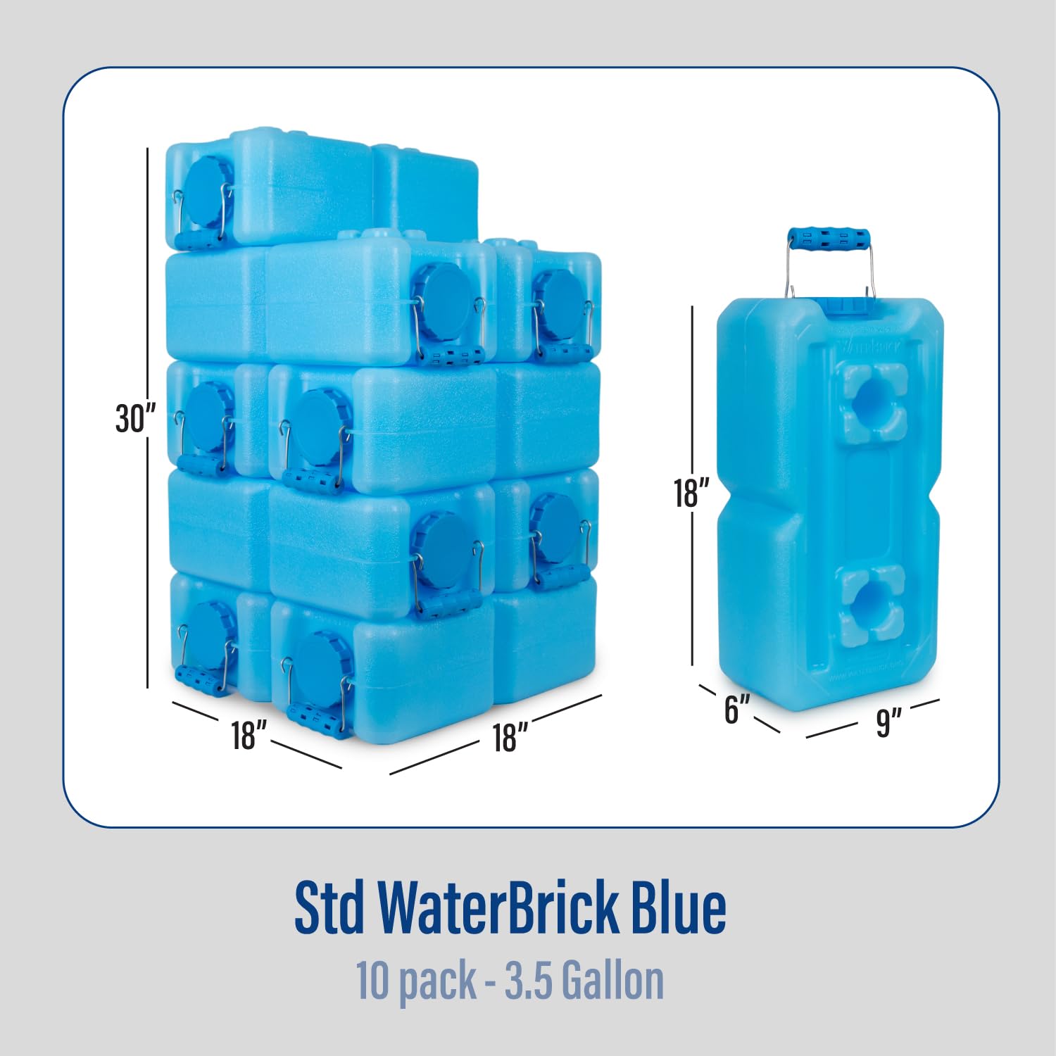 Stackable WaterBricks: Designed like no other water storage containers, the WaterBrick water cube is designed to be stackable, reducing occupied space and making them more easily storable. WaterBrick containers can be cross stacked 2 per row up to 4 feet high, or 8 rows. This pack of 10 stackable 3.5 gal containers offers a 35-gallon total combined storage capacity.