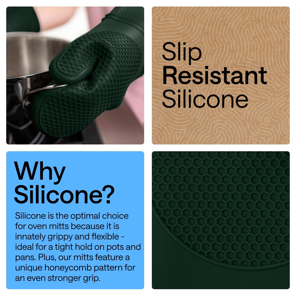 GET A BETTER GRIP: the best oven mitt pair; constructed of durable silicone, mitts are naturally slip resistant, helping you to get the best grip while you cook; unique textured honeycomb pattern helps you hold tight to pans, pots and baking sheets without hindering your natural grip