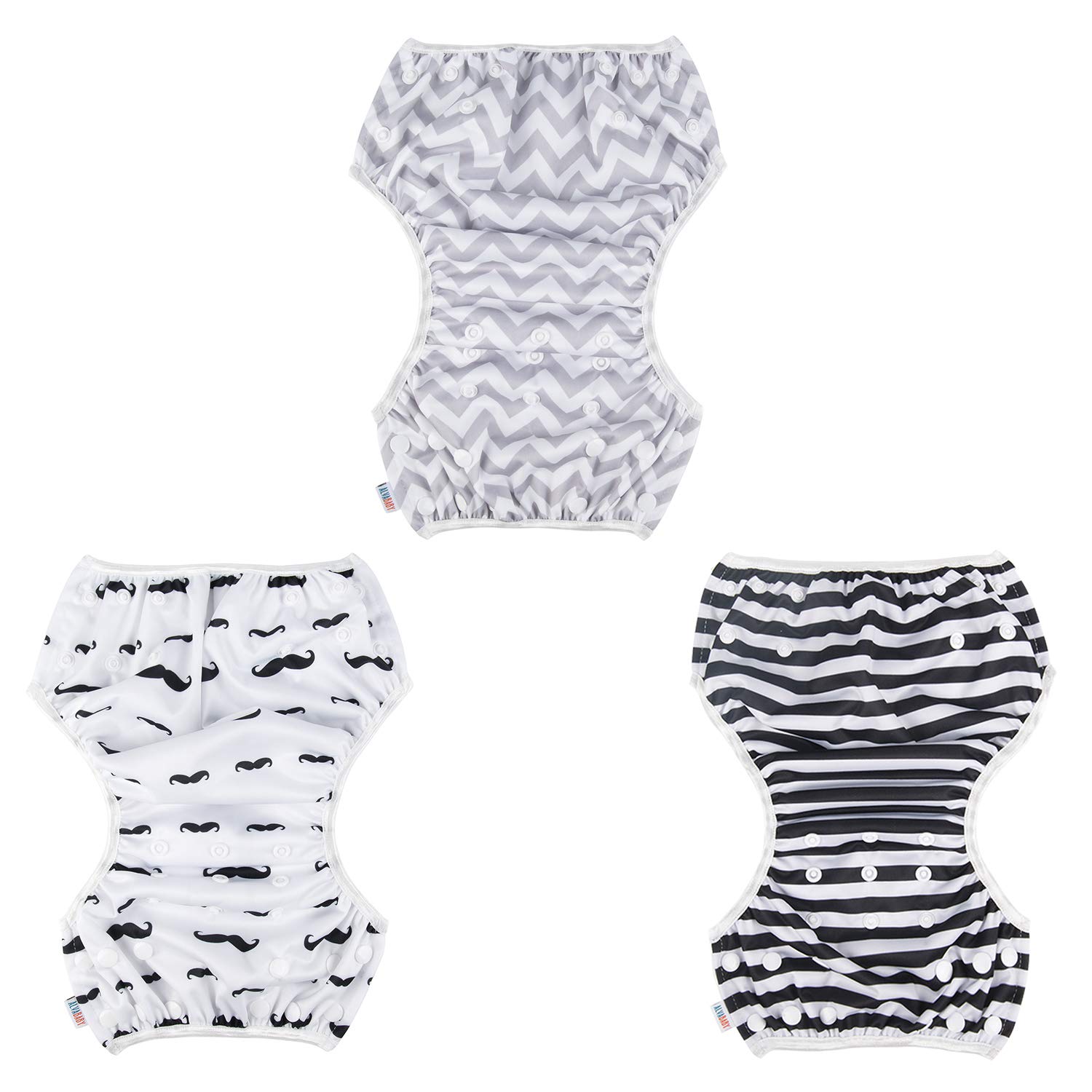 HIGN QUALITY, ADJUSTABLE, REUSABLE & WATERPROOF -ALVABABY swim diapers are made from waterproof 100% polyester PUL outer layer. Elastics waist and legs: Interior Polyester Elastics at the waist and leg openings with soft lycra bindings provides a secure, stretchy fit and easy on and off.