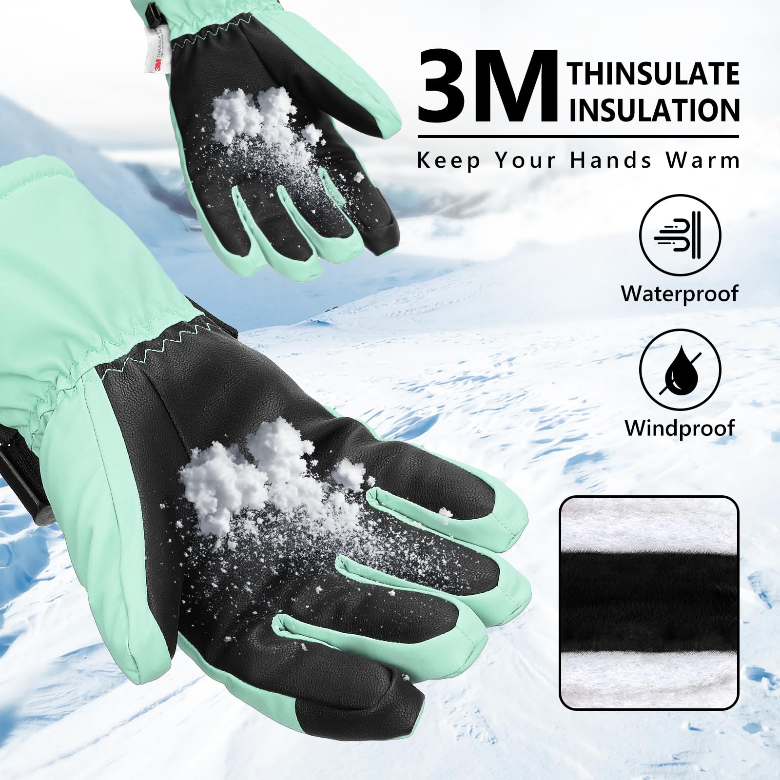 【Waterproof Ski Gloves】: The insert waterproof PU fabric can prevent snow water permeating into skiing gloves. You will enjoy with it for any outdoor sports like snowing or rainning.Windproof Kids Gloves: The gloves make of composite five-Layer fabric prevents cold wind and snows outside.