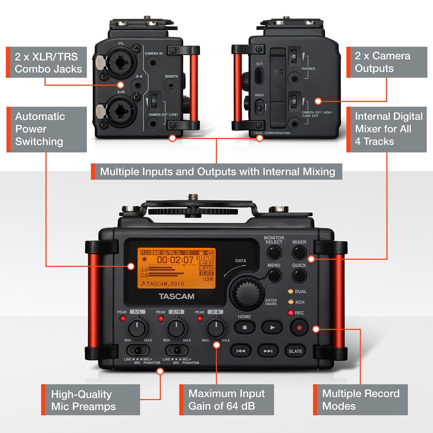 Two mic inputs utilize locking XLR connectors with 48V phantom power; the other two use a 1/8” stereo connector for wireless and lav mics