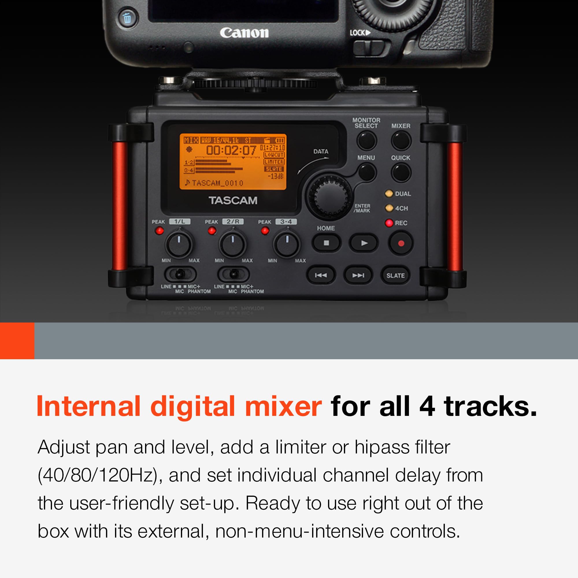 Fits perfectly under a DSLR camera rig, without relying on bulky recorders or the limits of the camera’s microphone in