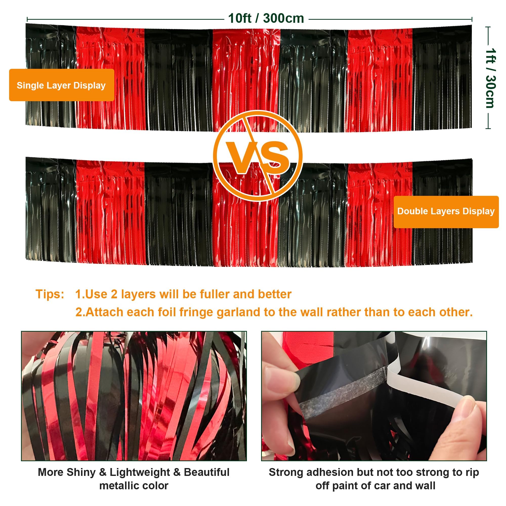 ✨【PACKAGE INCLUDES】✨ Comes with 4 packs of black red, each pack of 10*1 ft/3*0.3m (L*W ), You can cut it into any size to meet your decoration needs. If you want parade float decoration to be colorful, fuller, thicker and looks better, it is better to use more than 2 packs of fringe float overlapping together. And tape each foil fringe garland on the car/wall, not on top of each other. With these festive metallic streamers, you can take your parade float decorations to the next level