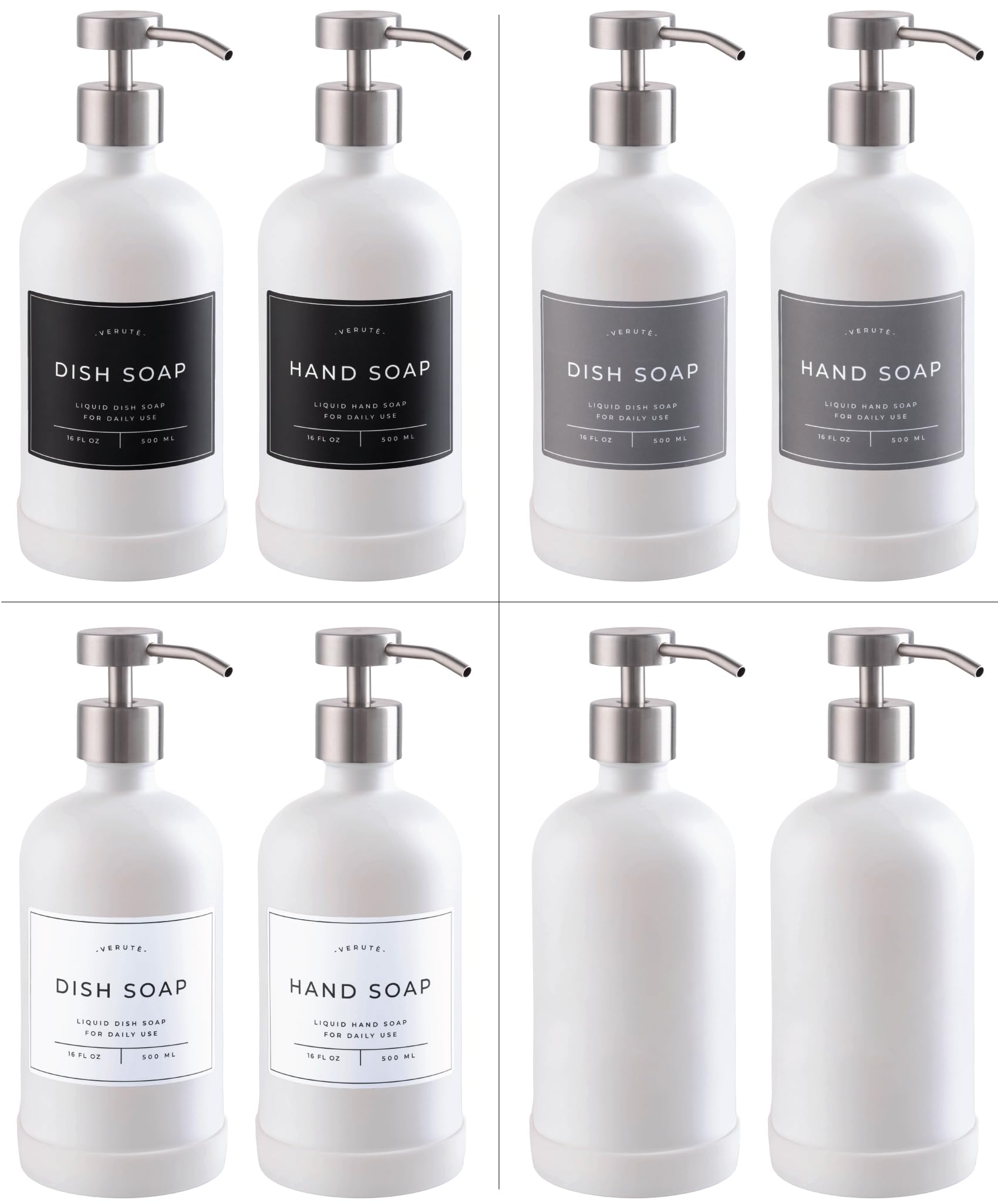 ORGANIZE YOUR HOME - Inside the set: 2 16oz glass bottles for your creams and liquid soaps; hand soap, dish soap, lotion, body wash, conditioner, shampoo and face wash labels in white, gray, and black colors; and 2 silicone trays.
