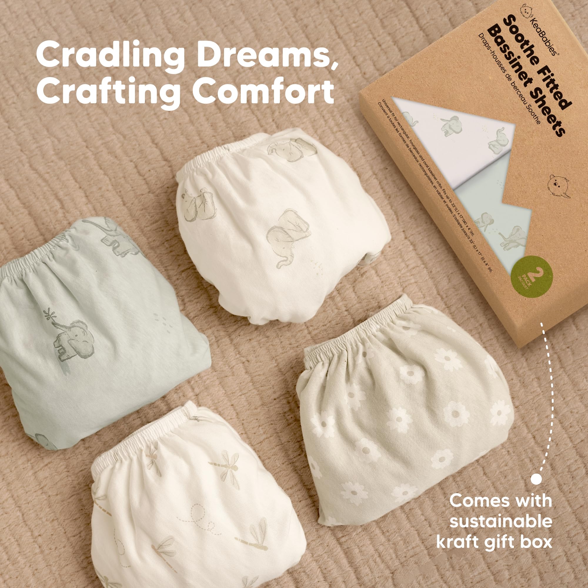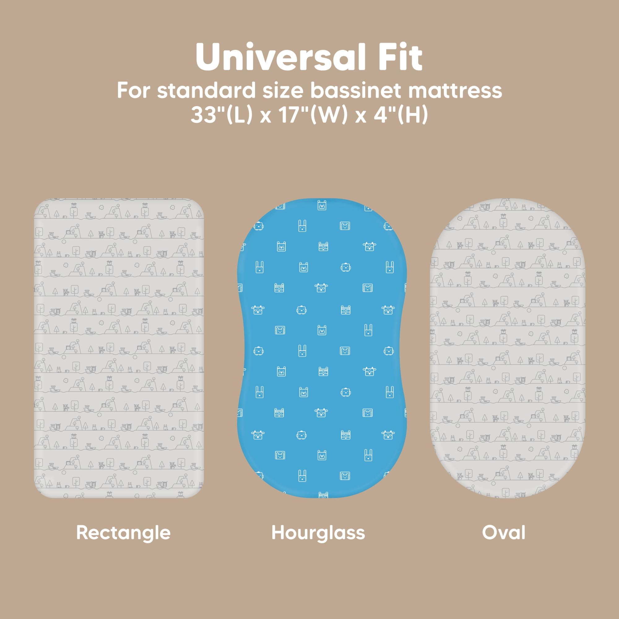 2-Pack Bassinet Fitted Sheets - KeaBabies Soothe Bassinet Mattress Sheets, sized at 33" x 17" with a depth of up to 4", provide a universal fit for all bassinet mattress pad types. They can be used as hourglass, oval, rectangle bassinet sheets.