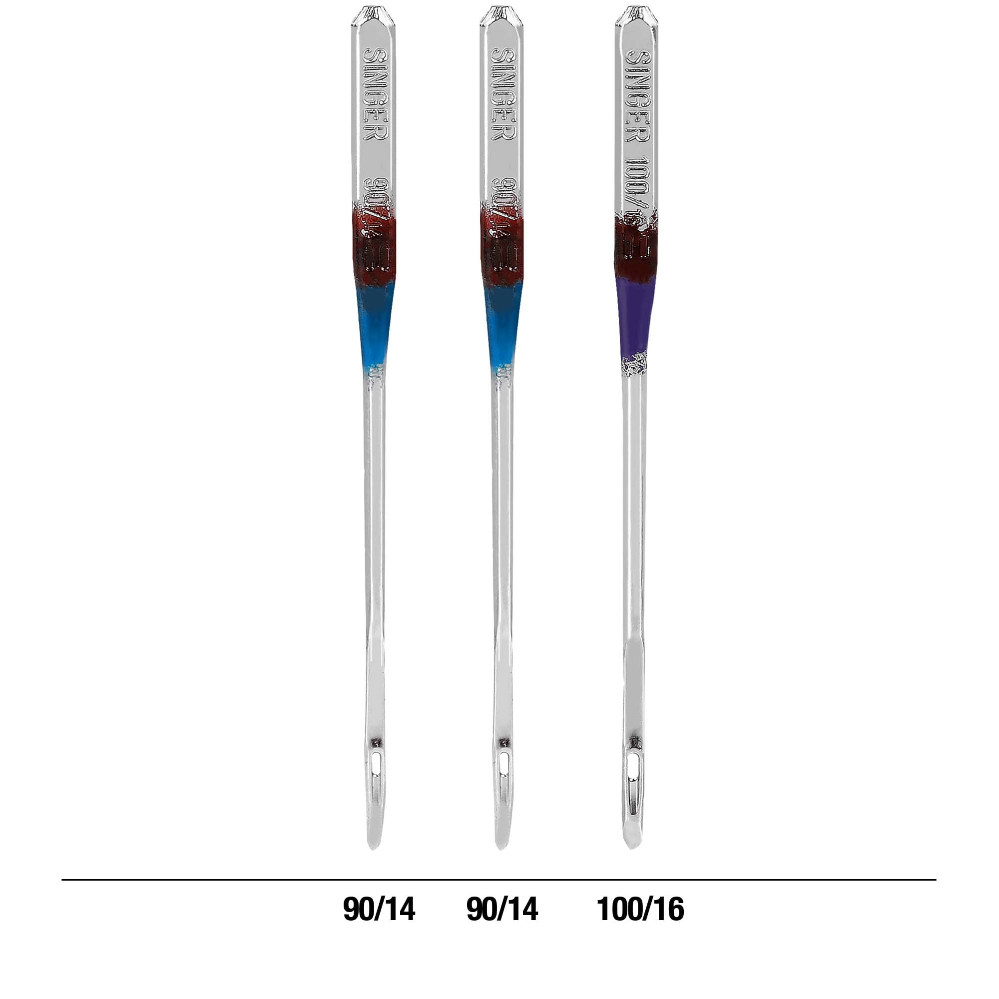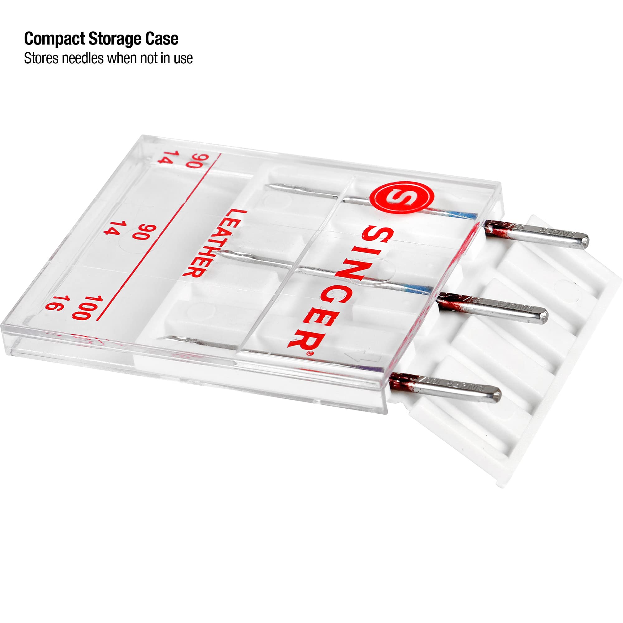 This set of 3 stainless steel machine needles is used for sewing leather and other heavyweight fabrics. Three leather needles, 2 sized 90/14, and 1 sized 100/16, are encased in a compact storage case with the sizing marked on its clear cover. Needles are for machine use, and can be used in Singer, Brother, Kenmore and other quality sewing machines.
