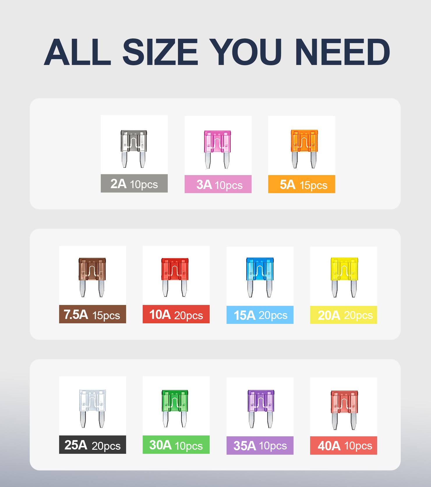 【High cost-effective fuse kit】-- The mini fuses automotive includes 160pcs mini fuses and a fuse puller. The mini blade fuses have 11 current specifications (2A /3A / 5A/ 7.5A/ 10A/ 15A/ 20A/ 25A/ 30A/ 35A/40A).Please also compare the original fuse size with our fuse size chart in detail before you purchase!