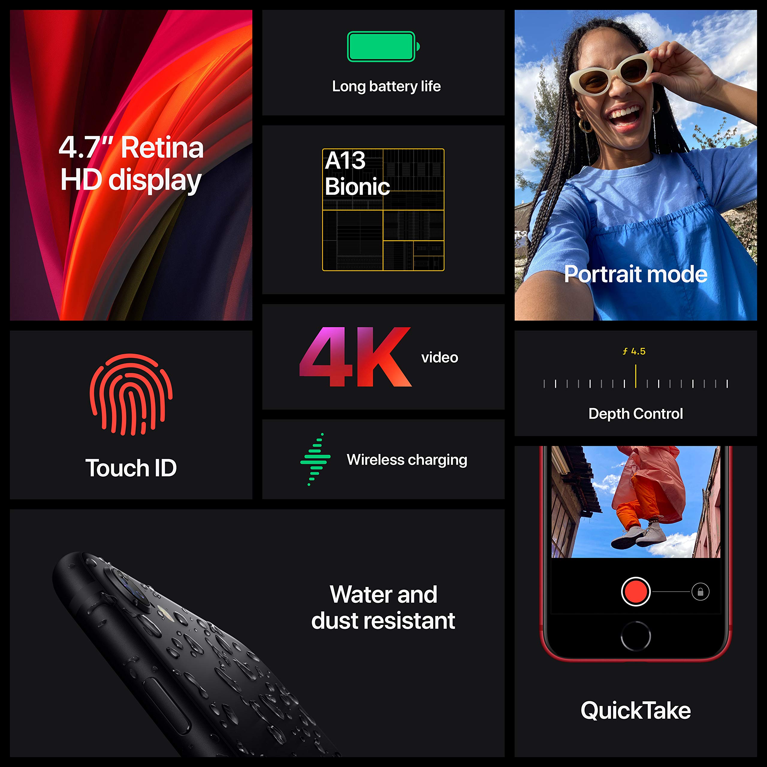 iPhone SE is the most powerful 4.7-inch iPhone ever. Featuring A13 Bionic, the fastest chip in a smartphone, for incredible performance in apps, games, and photography. Portrait mode for studio-quality portraits and six lighting effects. Next-generation Smart HDR for incredible detail across highlights and shadows. Cinematic-quality 4K video. And all the advanced features of iOS. With long battery life and water resistance, it’s so much of the iPhone you love, in a not so big size.