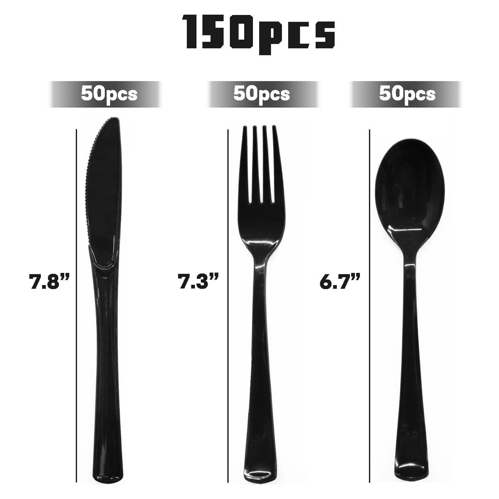 【Cost-Effective Black Cutlery Set】: This black plastic silverware includes 50 black plastic forks, 50 black spoons and 50 black knives, totaling 150 heavy duty plastic silverware. The black plastic silverware is versatile and affordable for everyday use, family gatherings or business purposes.