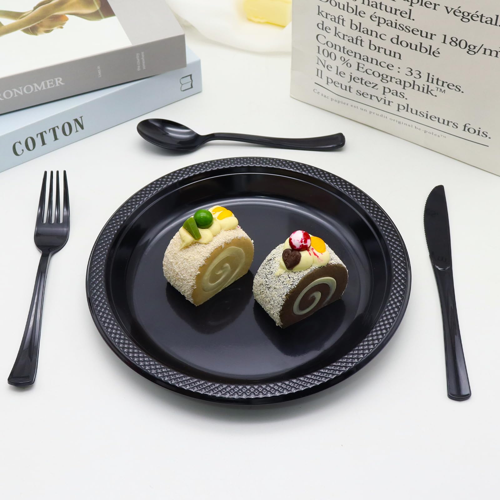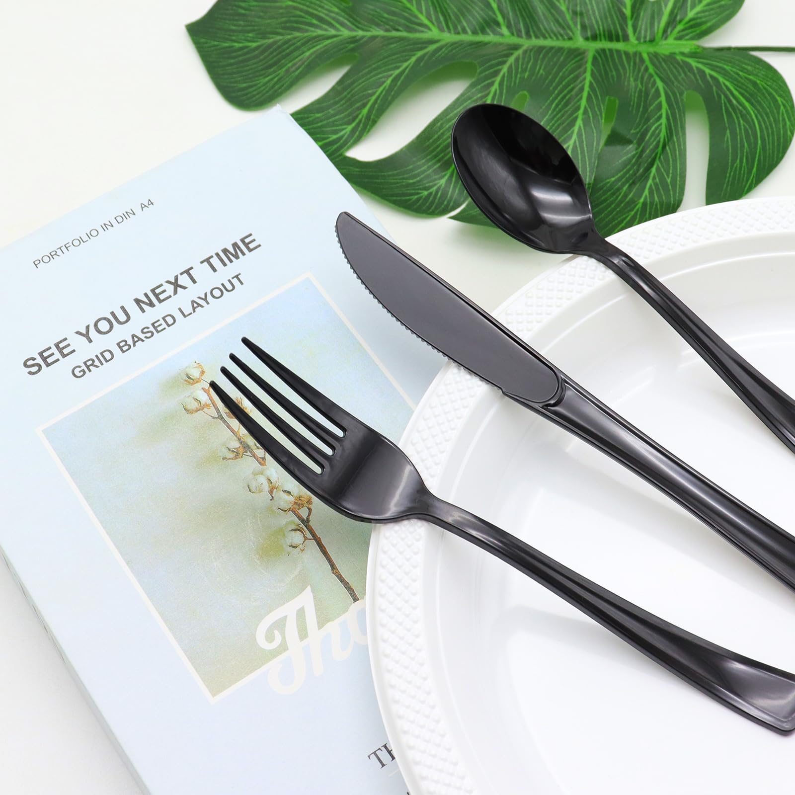 【Reliable Quality】: The plastic silverware is made of food-grade plastic material, which is non-toxic and harmless and can be in direct contact with food. Thickly designed at the handle, it is less prone to breakage and deformity, and has excellent durability and reliability. High-temperature resistant and suitable for all types of food, whether cutting meat or scooping soup, the black plastic silverware meets customers' needs.