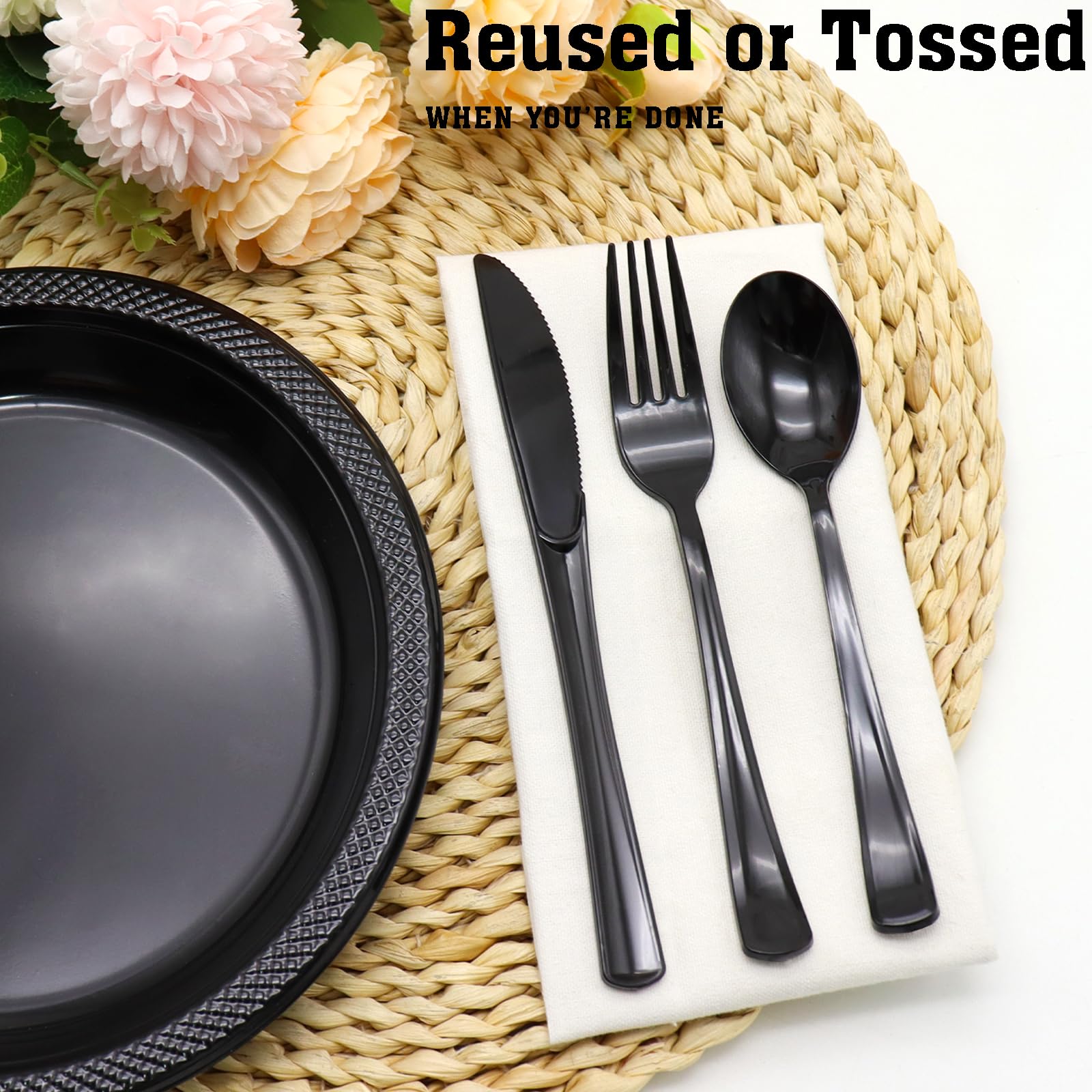 【Convenient and Reusable】The black plastic silverware is disposable and can easily be thrown away after the party, eliminating the hassle of a long wash and clean-up so you can focus on having a great time with friends and family. Of course, if you want to continue using the black plastic silverware, simply wash it in soapy water to restore its lustre and get it ready for your next party.