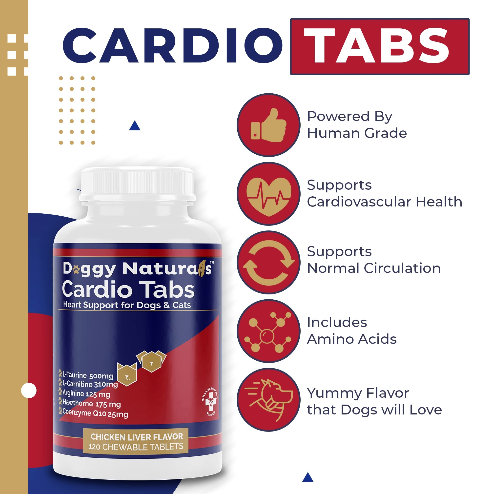 A strong heart helps keep our pets playing, running and by our side for many years. The premium ingredients in these delicious Chicken Liver tablets help support canine function. Each tablet contains L-Taurine, L-Carnitine, Hawthorn, Arginine ,Magnesium, N,N-Dimethylglycine HCI (DMG), Coenzyme Q10,Vitamin E, Berberine, Folic Acid that supports normal circulation for pets. Helps strengthen the heart Muscles Taurine is an Amino Acid essential to yours pets diet and metabolic process No Additive, fillers or preservatives Active Ingredients:- Taurine……………………………………….. 500mg L-Carnitine……………………………..…..…. 310mg Arginine ………………………..…….……..…..125 mg Hawthorn….………………………..………..… 175 mg Magnesium ……………………..…..….….…….50 mg N,N-Dimethylglycine HCI (DMG) ……..……….30 mg Coenzyme Q10 ………….….…..….……………25mg Vitamin E …….……………….….……………….40 IU Berberine …………………………………………1 mg Folic Acid……………………………………… 270 mcg Others Ingredients:Brewer's Yeast, Calcium Phosphate, Chicken Liver, Compressible Sugar, Hydrolyzed Vegetable Protein, Invert Sugar, Magnesium Stearate, Microcrystalline Cellulose, Silicon Dioxide, Stearic Acid, Whey Powder.