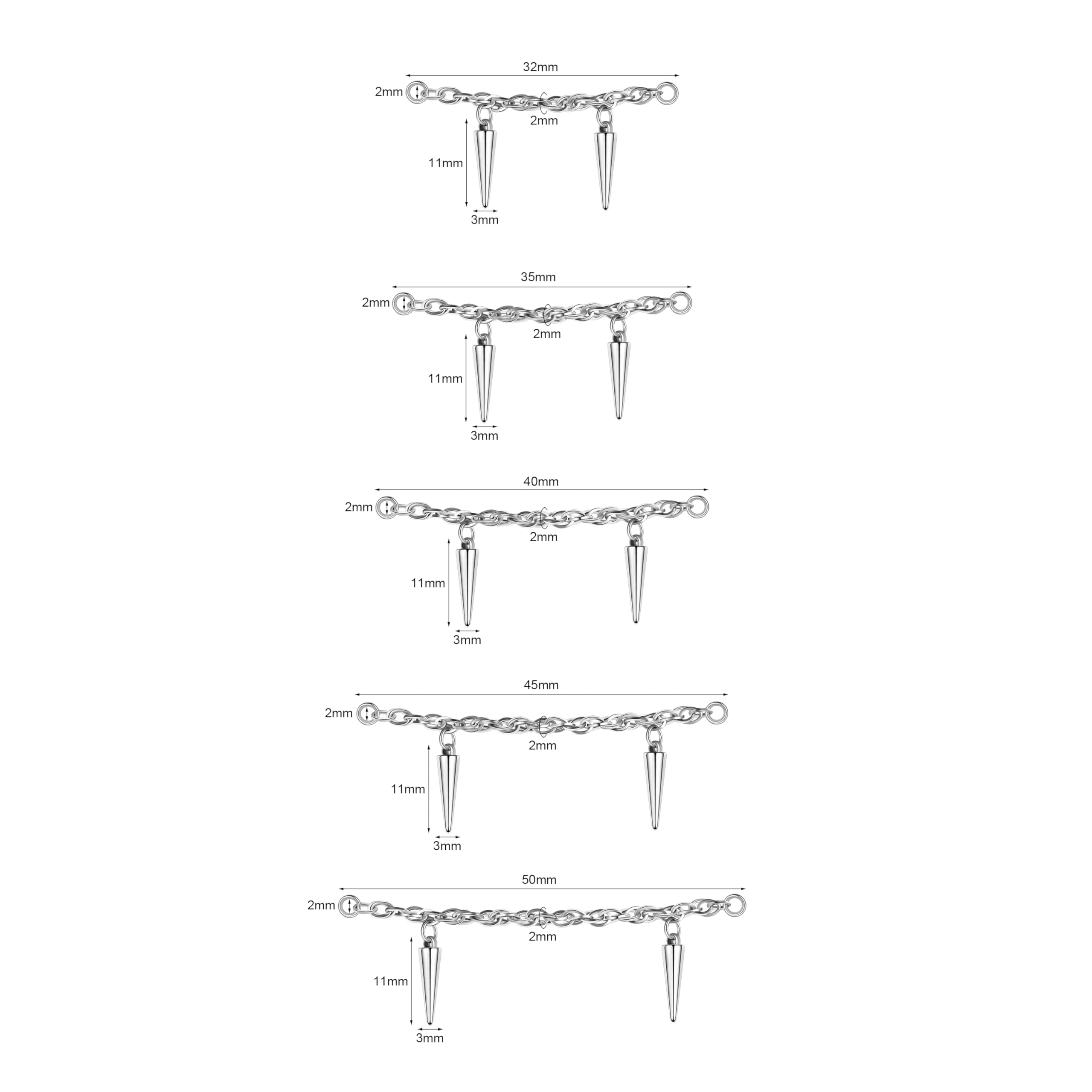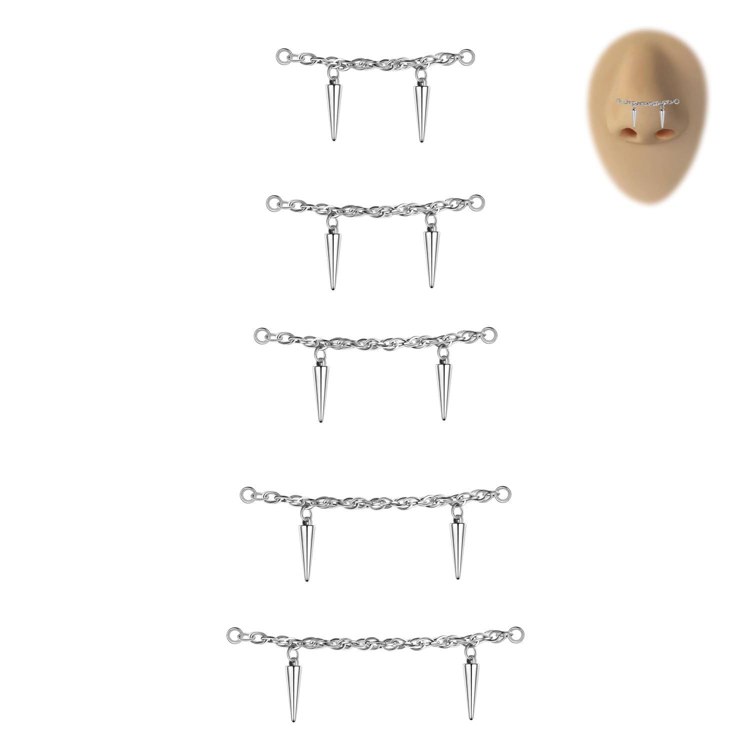 ★Packaging & Size: Five different sizes of nose ring chains, 32mm, 35mm, 40mm, 45mm, 50mm, meet your wearing needs for different parts. (This set does not include nose studs, nose rings, or earrings)