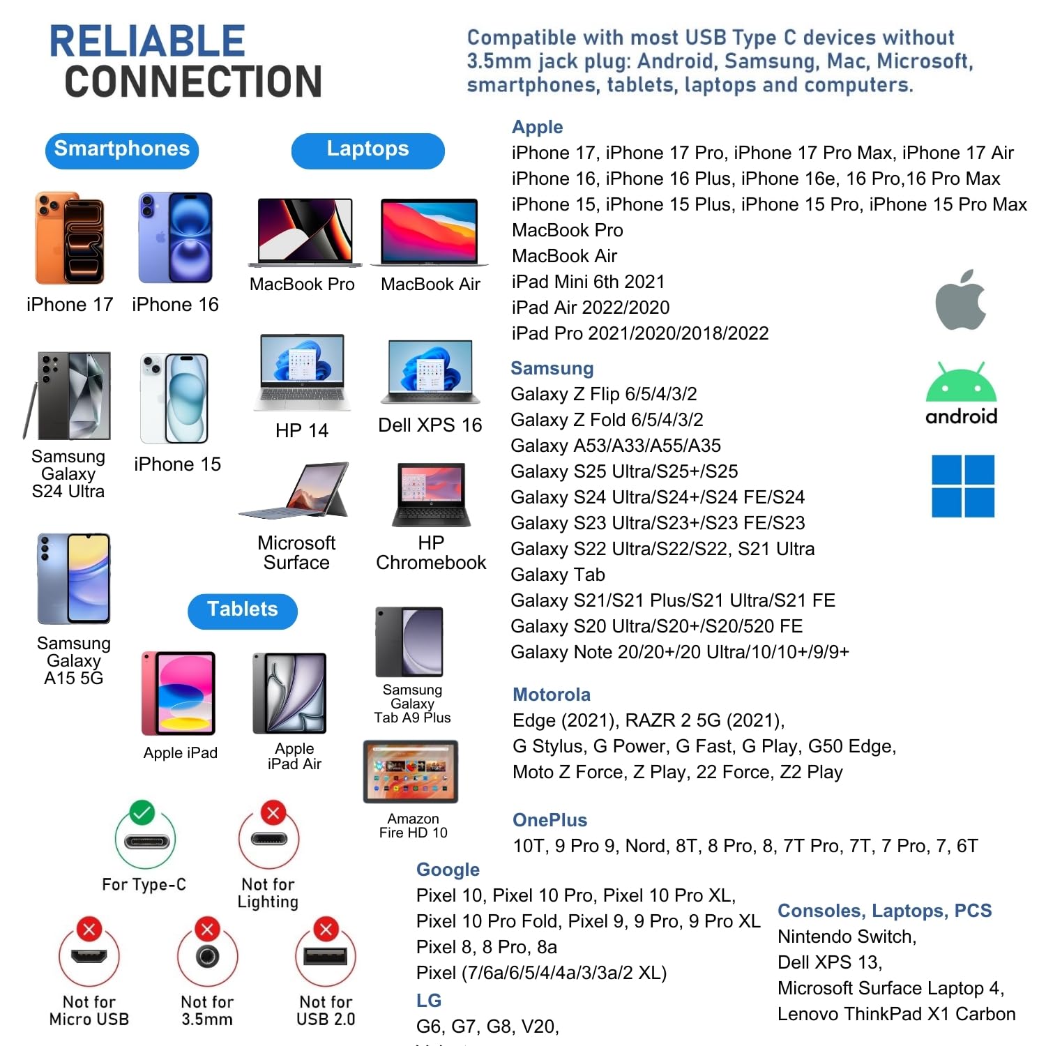 SAMSUNG: Galaxy S24/S23/S22/S21/S21+/S21 Ultra/S21/S21 Ultra/S21 FE/S20/ Galaxy Tab S8/S7/S6/S5e, A53/A54/A55/A33/A34/A35 Galaxy Z Flip 6/5/4/3/2 Fold 6/5/4/3/2 - GOOGLE Pixel 10/Pro/XL/Fold, Pixel 9/Pro/XL, 8/Pro/8a, 7/6a/6 PRO/6/5/4/4a — MOTOROLA Edge 2021 — LAPTOPS: DELL XPS 13, MICROSOFT Surface Laptop 4. And more devices without a 3.5mm jack port. We provide a 5-year warranty and our customer support is here to answer questions 24/7