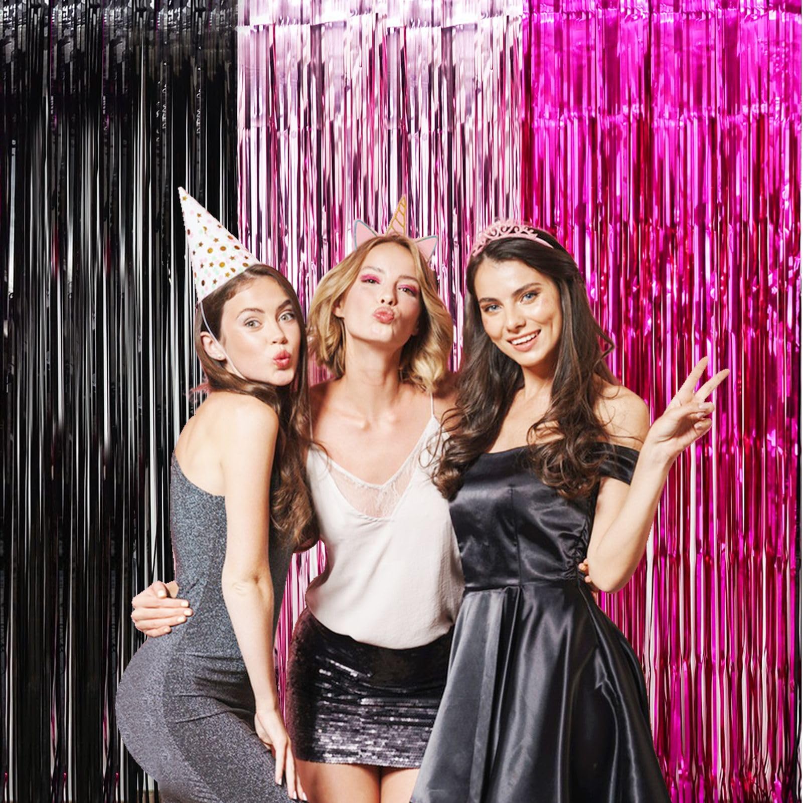 BLACK PINK PARTY SUPPLIES: The package includes 3 pack foil fringe backdrop curtains, each metallic tinsel curtain is 3.2ft(wide)×8.2ft(drop), wonderful accessories for decorating doorway, window and walls.