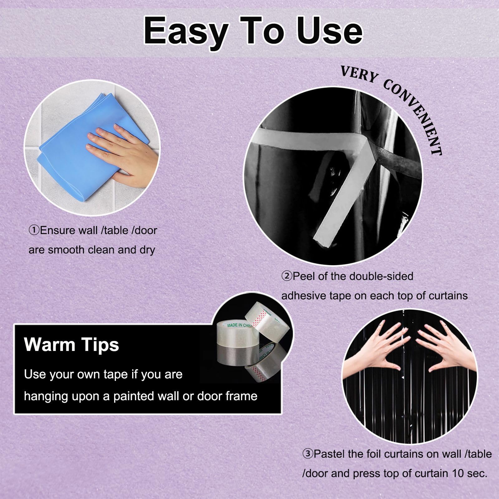 WARM TIPS: To ensure that foil fringe curtains stay in place and can be easily removed without any damage, please use your own adhesive tape if you are hanging them on a painted wall, door frame, or unsmooth walls, or if you want to reuse them for next time.
