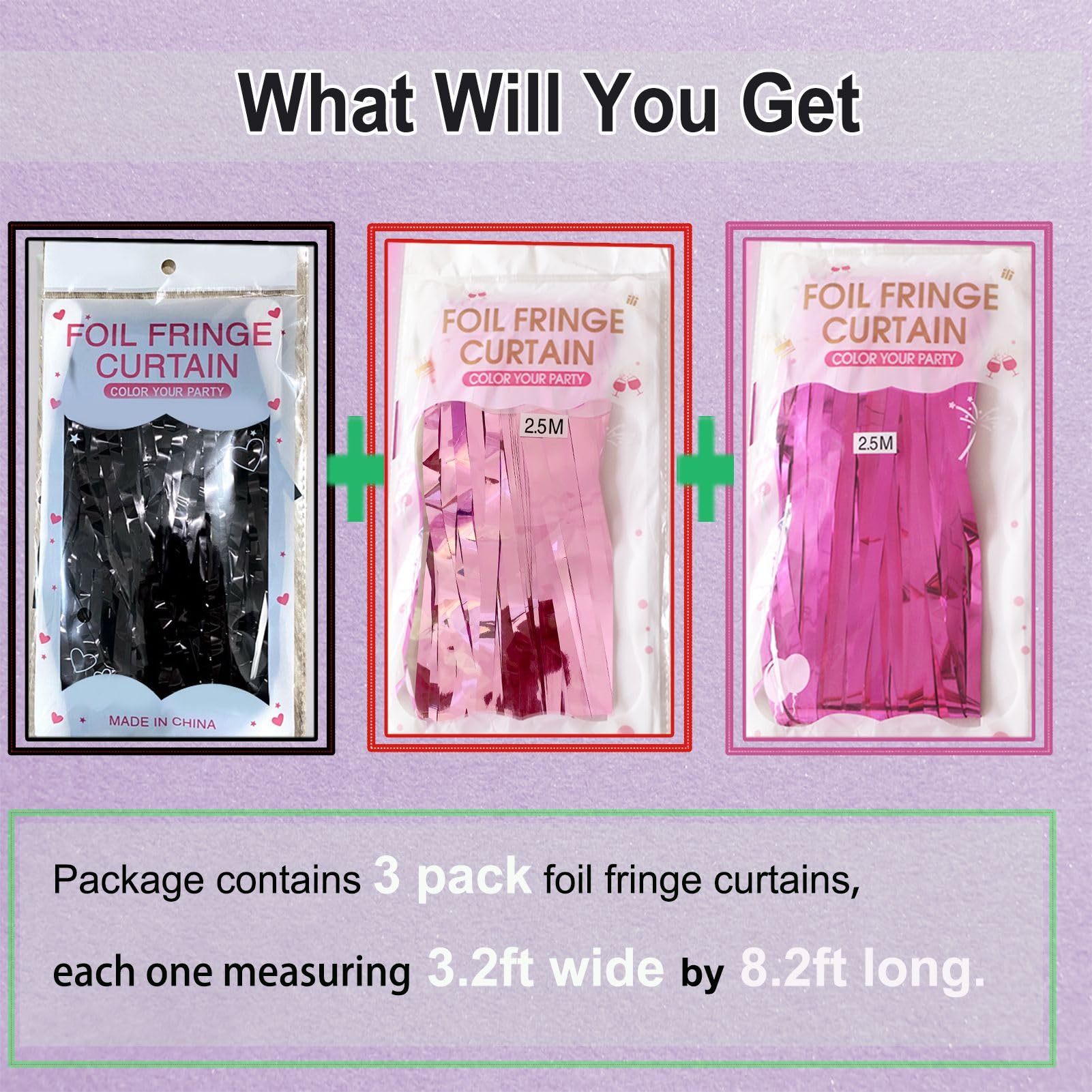 The package includes 3 pack foil fringe backdrop curtains( 1 pack black foil fringe curtain + 1 pack pink foil fringe curtain +1 pack fuchsia foil fringe curtain), each metallic tinsel curtain is 3.2ft(wide)×8.2ft(drop)