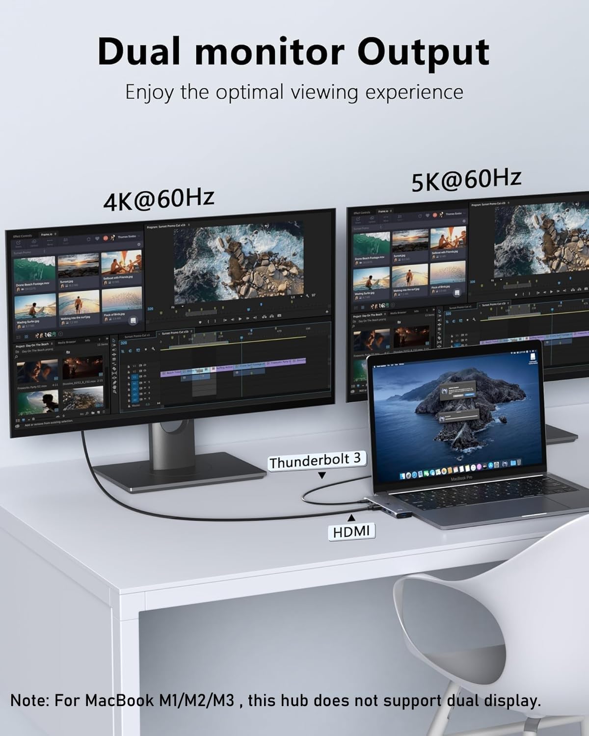 【A Multifunctional USB-C port compatible with Thunderbolt 3/4 】In this Macbook Pro dongle,one USB-C Port compatible with Thunderbolt 3/4 supports data transfer up to 40Gb/s, up to 5K displays, up to 100W power; It and HDMI port can be used simultaneously to support dual monitor display ,to mirror or extend your laptop's display to your TV, monitor or projector[Note: For M1M2M3 , this macbook accessories does not support dual display. Another usb c port is only for data transfer, speed usb 3.0 ]