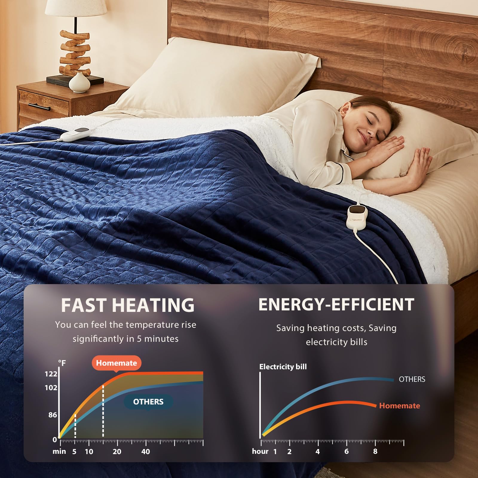 ENERGY SAVING: Homemate heated blanket use the intelligent temperature adjustment technology.When the temperature rises,the heated blanket will automatically adjust the temperature according to the surrounding environment,which can always provide users with a comfortable feeling and is conducive to energy saving.Compared with air conditioner,using Homemate heated blanket is more energy efficient,and you can save more heating costs in winter.