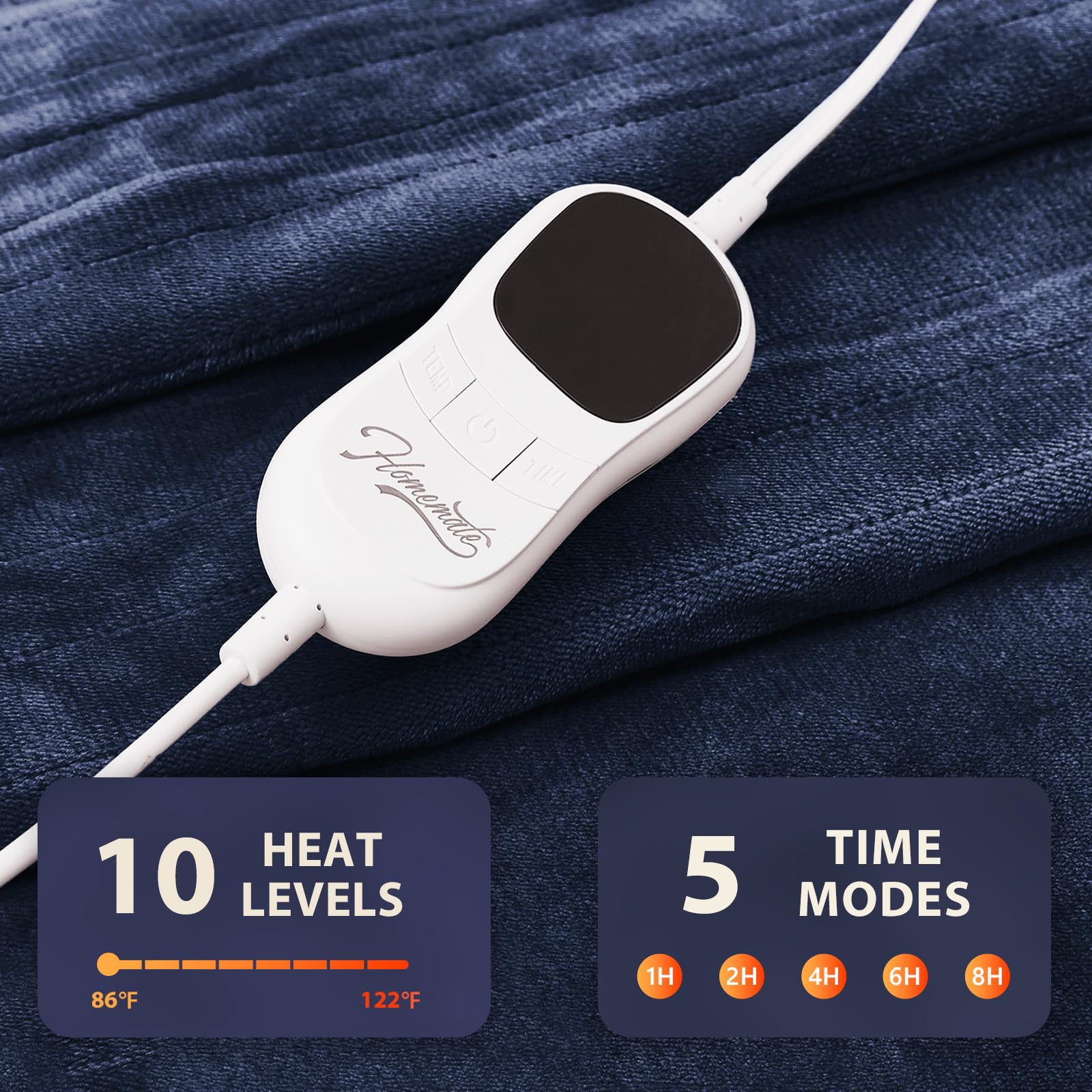 EASY TO USE: Homemate heated blanket have 10 heat levels,1/2/4/6/8 hours auto shut off.Temperature range is 86-122°F.Very convenient to use,even the elderly,the sick,and the disabled can use it easily.Power Cord is 16.7 feet,this long cord makes the use of the blanket more flexible,can be used on the bed,on the sofa,can be used in the study and office,very convenient.