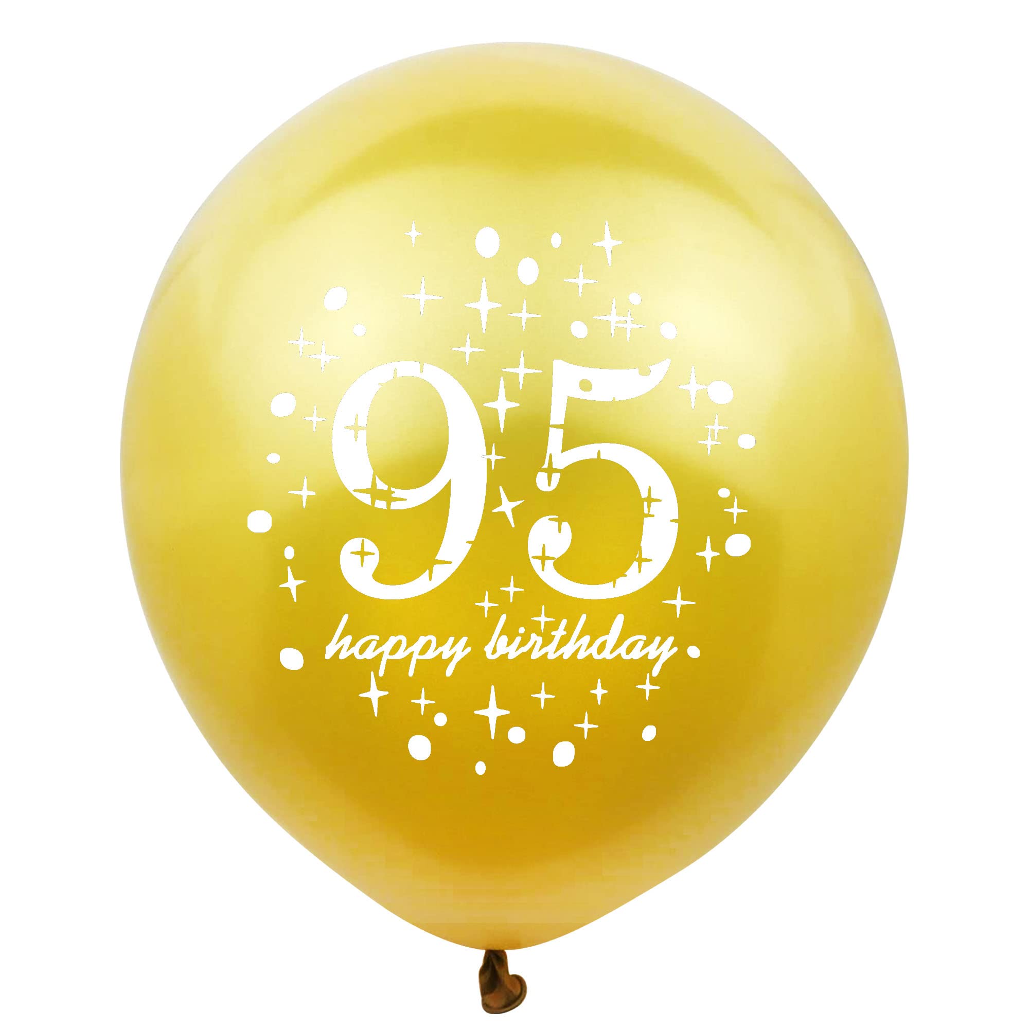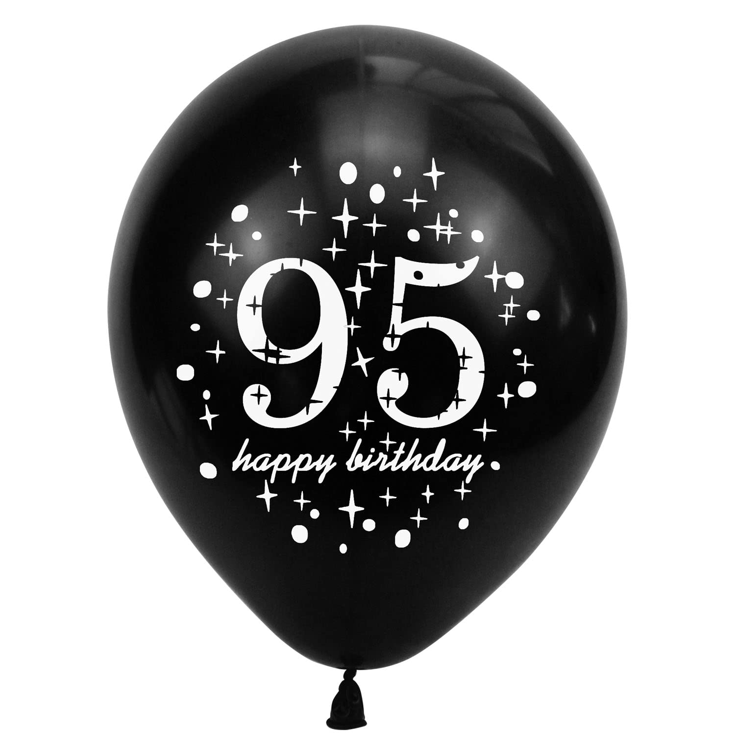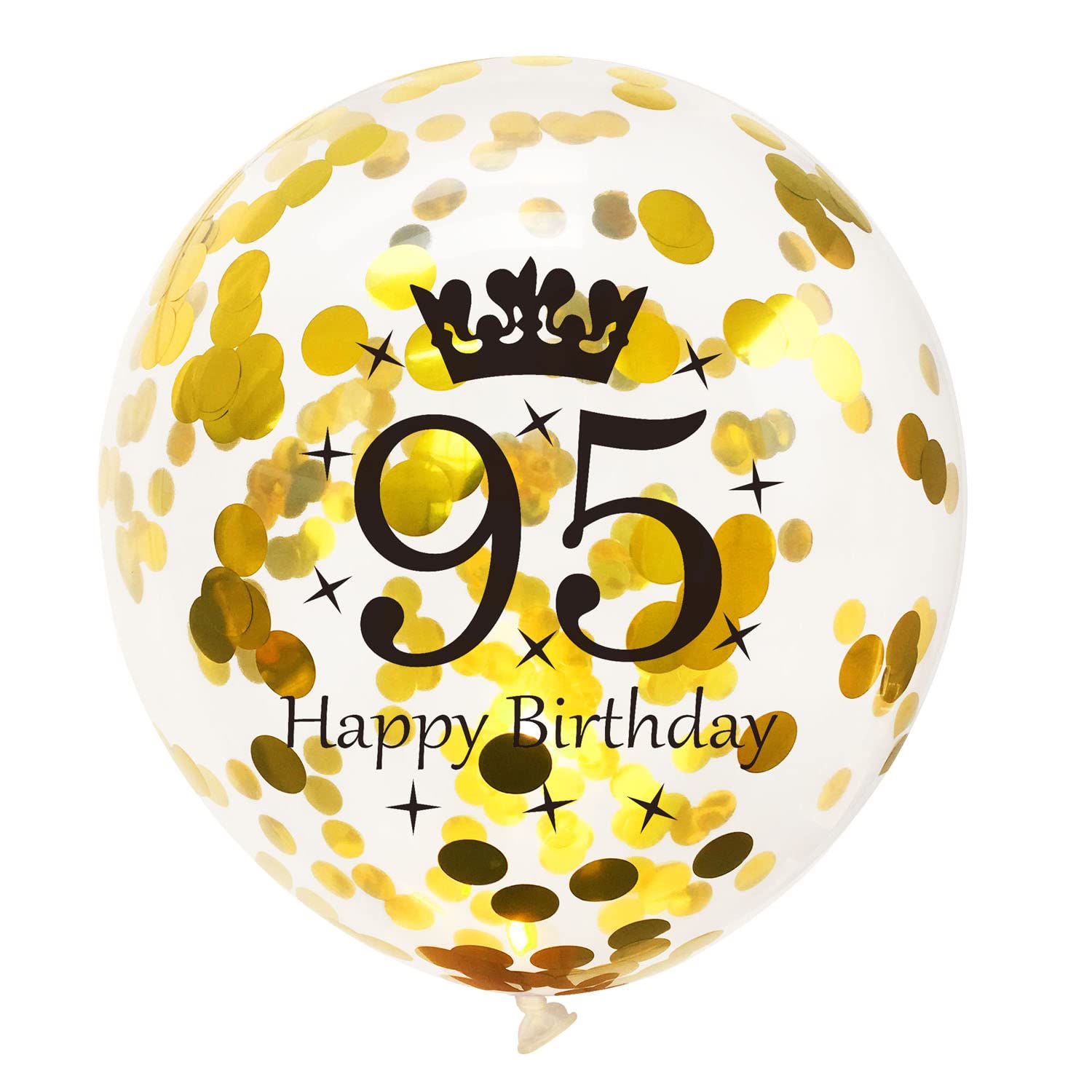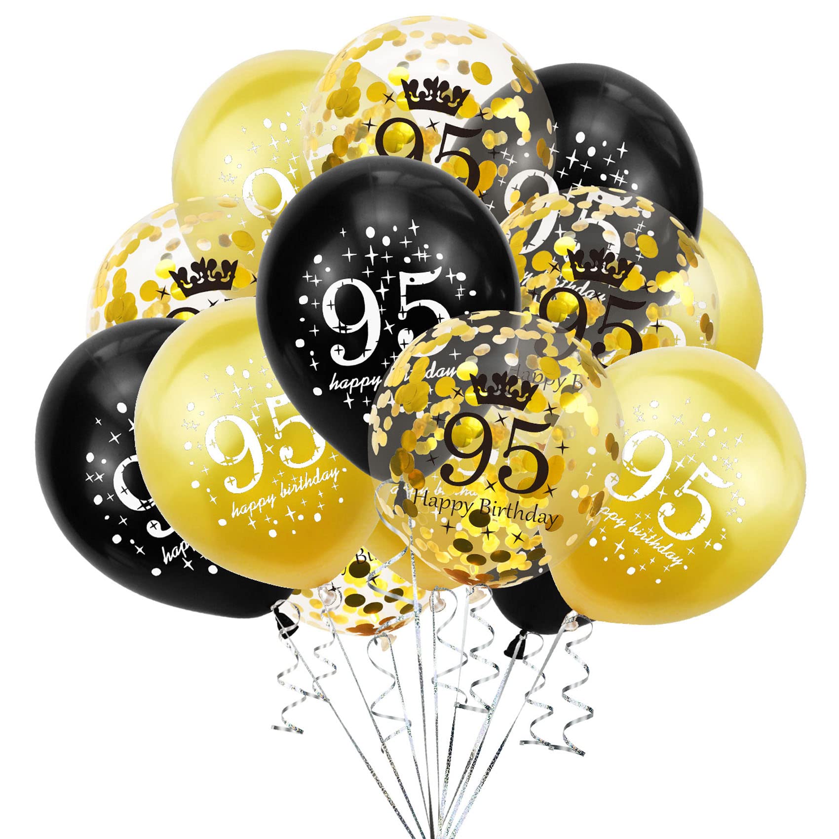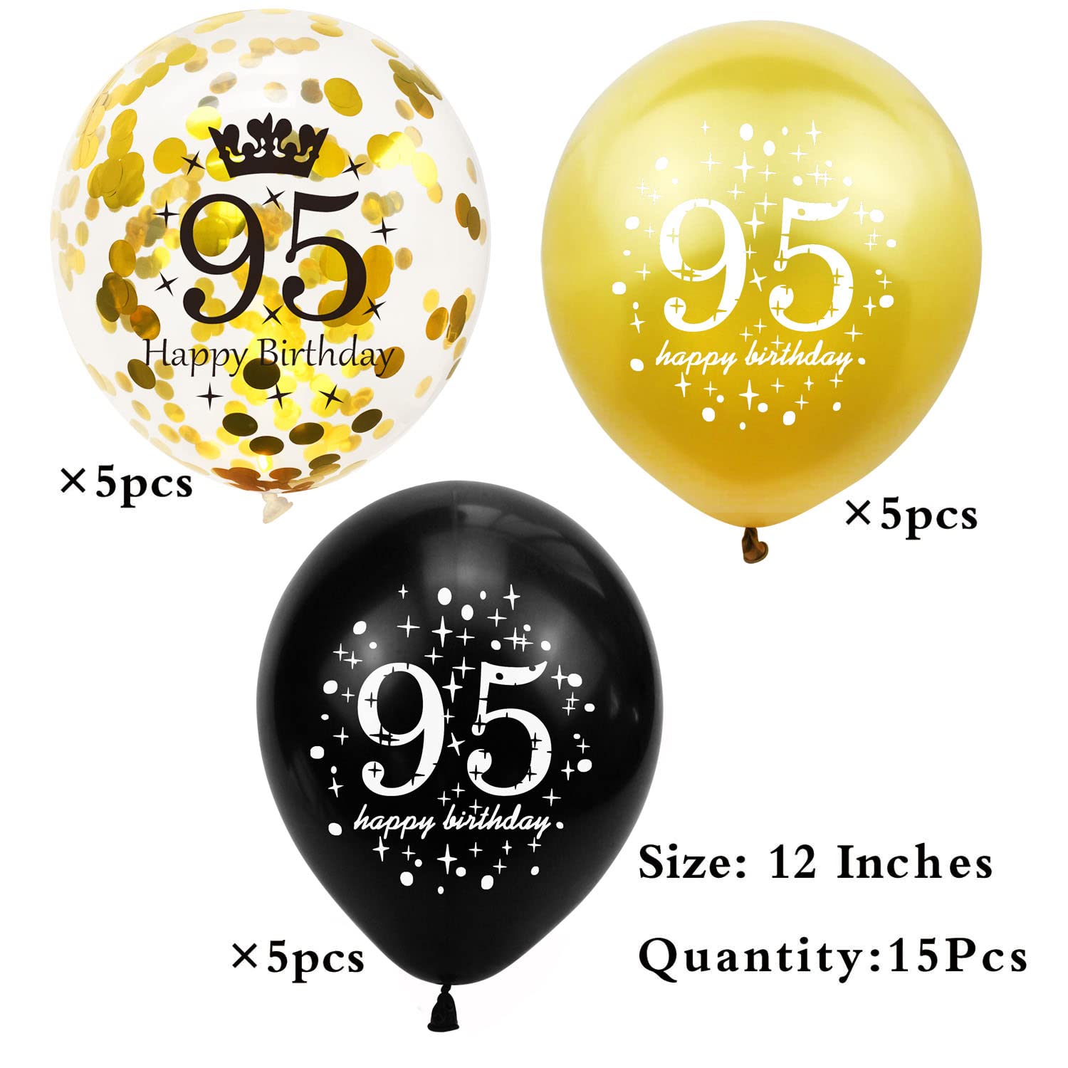 Package:5 pieces 12 inch black latex balloon printed with the words "95 Happy Birthday",5 pieces 12 inch gold latex balloon printed with the words"95 Happy Birthday",5 piece 12 inch gold confetti balloons printed with the words"95 Happy Birthday",very suitable for women men 95th birthday party decorations