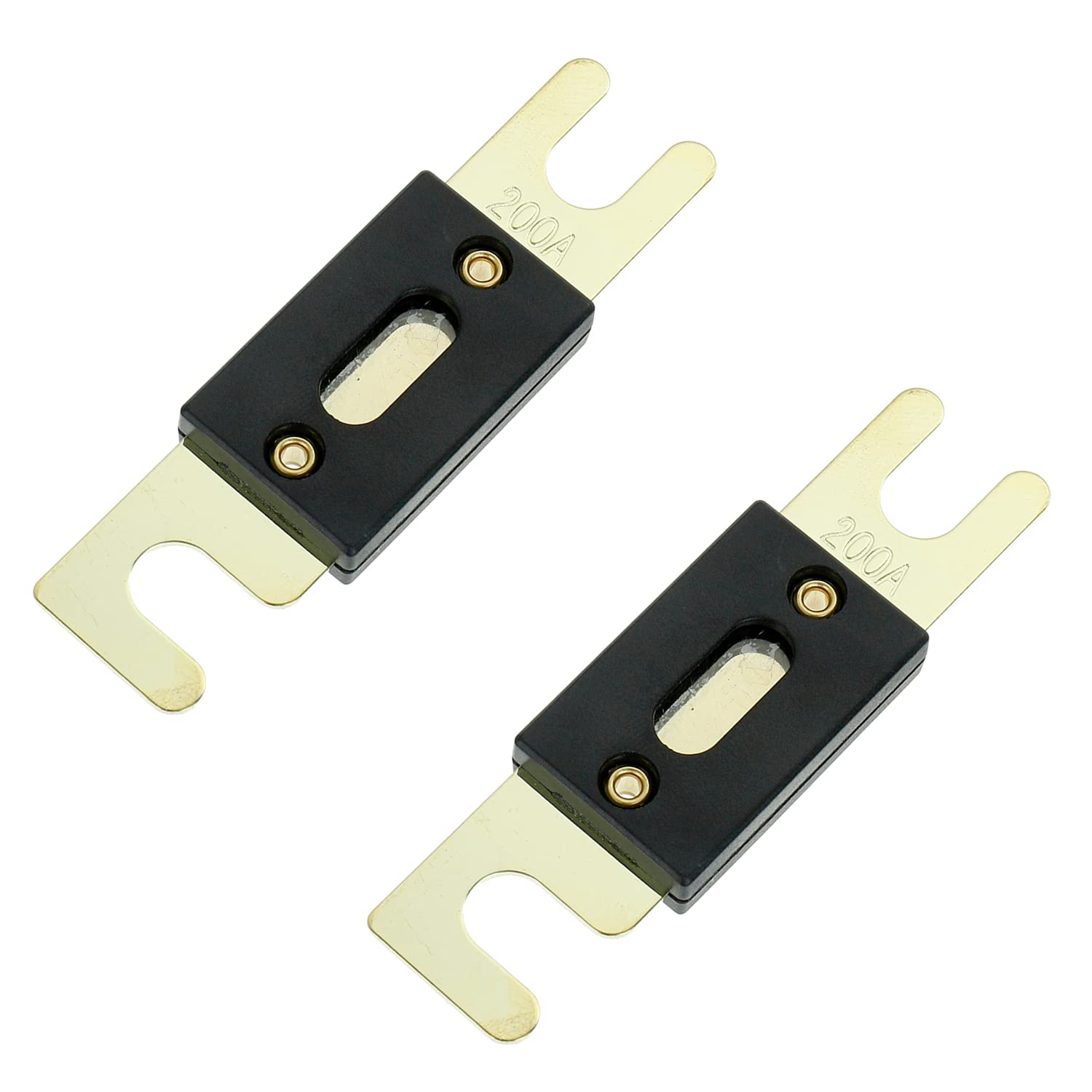 BOJACK 2 Pcs ANL Fuse Holder with 2 Pcs 200 Amp Fuses High-quality products, strong conductivity, waterproof and dustproof, durable and reliable. Fuse Size: 80x22.5x9 mm/ 3.15x0.9x0.35 inch (L*W*T); Fuse Holder Size: 123 x 37 x 40mm / 4.8 x 1.5 x 1.6 inch (L*W*H). Rated voltage: 32VDC Reach 100% of rated voltage and melt in 4 hours at the fastest. Reaching 200% of the rated voltage, melting is the slowest 10 seconds. It reaches 350% of the rated voltage and melts in 0.5 seconds at the slowest. Material: copper alloy, gold plating and PVC material Gold plating metal sheet construction with a clear protective non-conductive resistant cover Package Content: 2 * ANL fuse holder 2 * 200A ANL fuse
