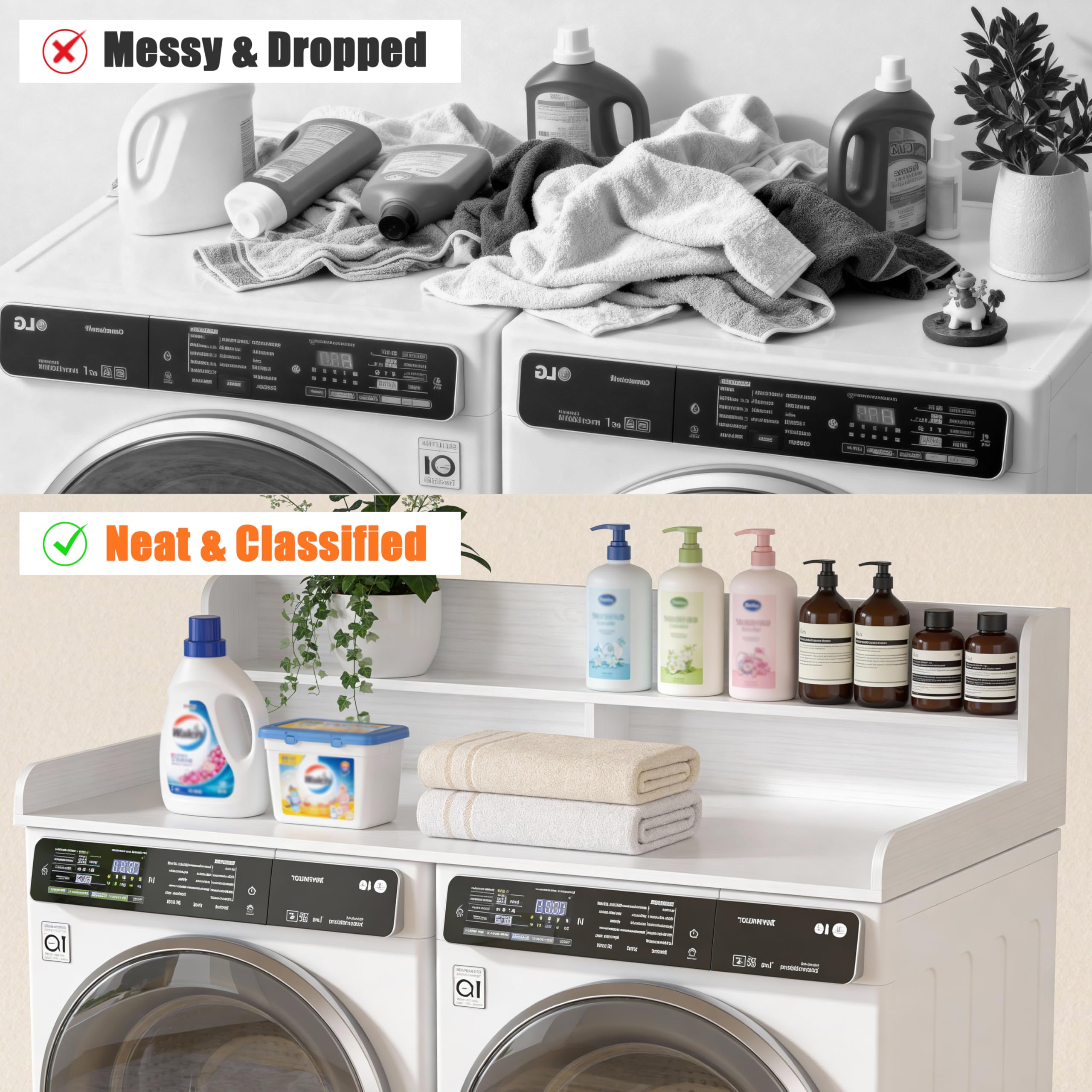 【Space Optimization】The Washer Dryer Countertop design fully considers the convenience of use and provides reasonable operation space and storage area. You can easily place washing supplies, clothes drying racks and other items, reduce bending and moving when taking them, and improve the efficiency of washing and drying.