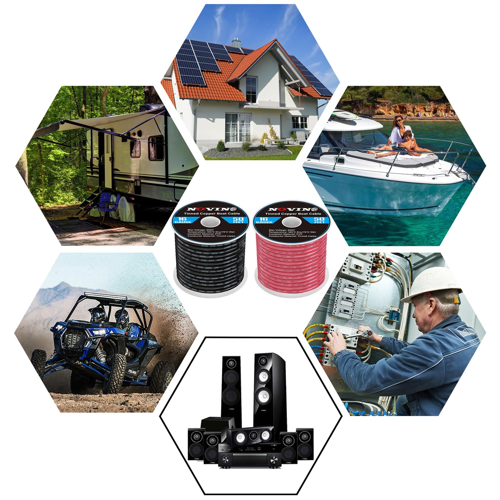 Multi Use: the 16 gauge marine grade wire use in pontoon boat/bass boat/boat trailer/ fish finder/truck/RV/Van/ATV trailer/Motorcycle electrical system:wiring light (spotlight,underwater light,flood light,navigation lights,headlight), solar inverters, shore power,bilge pump,extend new bank charger leads, speaker wire,electric brake wires, radio stereo, alarm,car audio radio,amplifier power