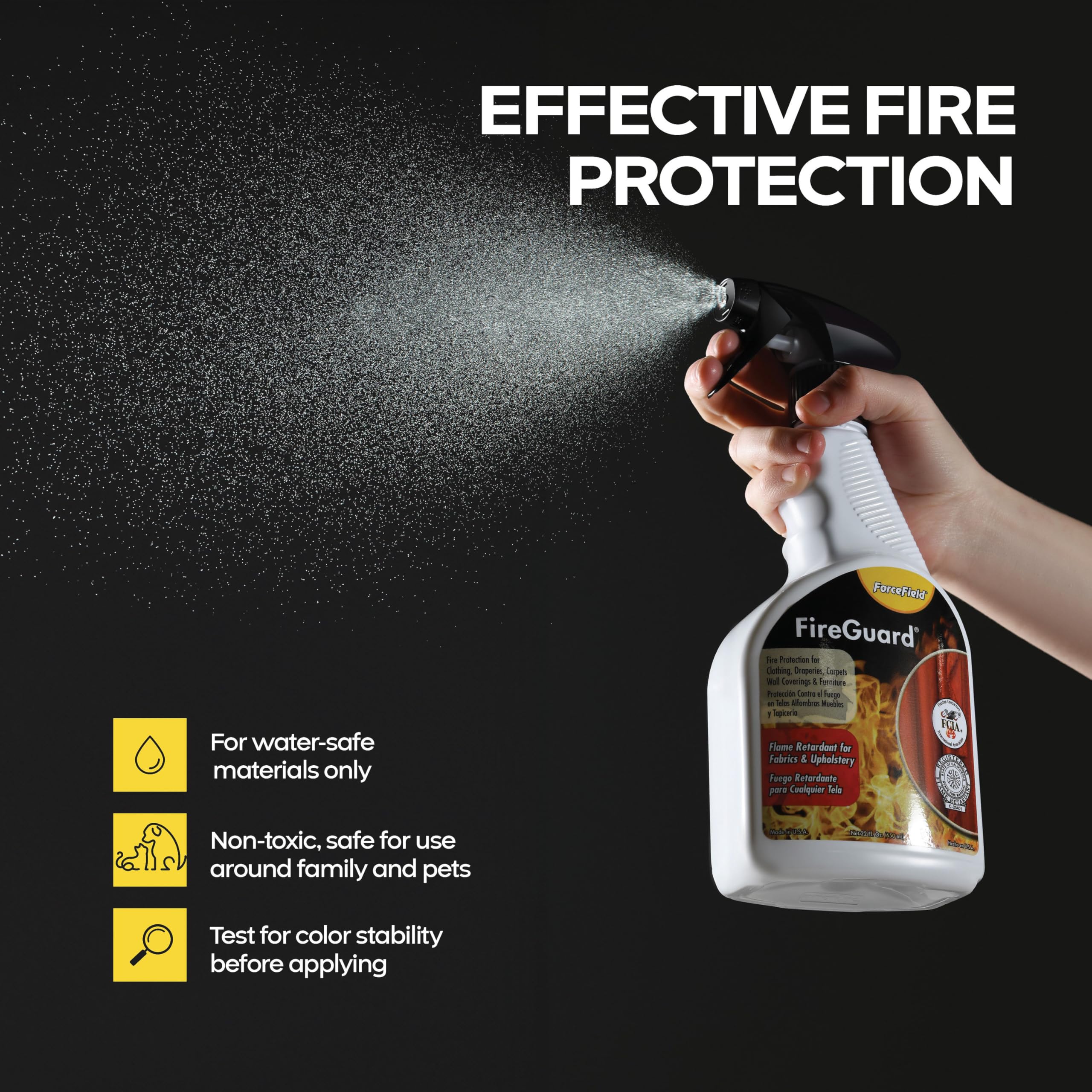 FLAME RETARDANT -- Prevents flames from burning your favorite drapes, clothing, furniture, ect.RESISTANT TO SPREAD - In an event of a fire, the Fire Guard prevents the spread of fire and reduces smoke from developing further STAIN PROTECTION -- Designed for fabrics that have not been treated with water proofing stain protection due to being water-based MEETS NATIONAL STANDARD -- This product has been successfully tested in accordance with and meets the standards established by the National Fire Protection Association Test Method SAFE & EASY - The Fire Guard is consists of a nonhazardous formula making it environmentally friendly and is easy to apply/ clean up.