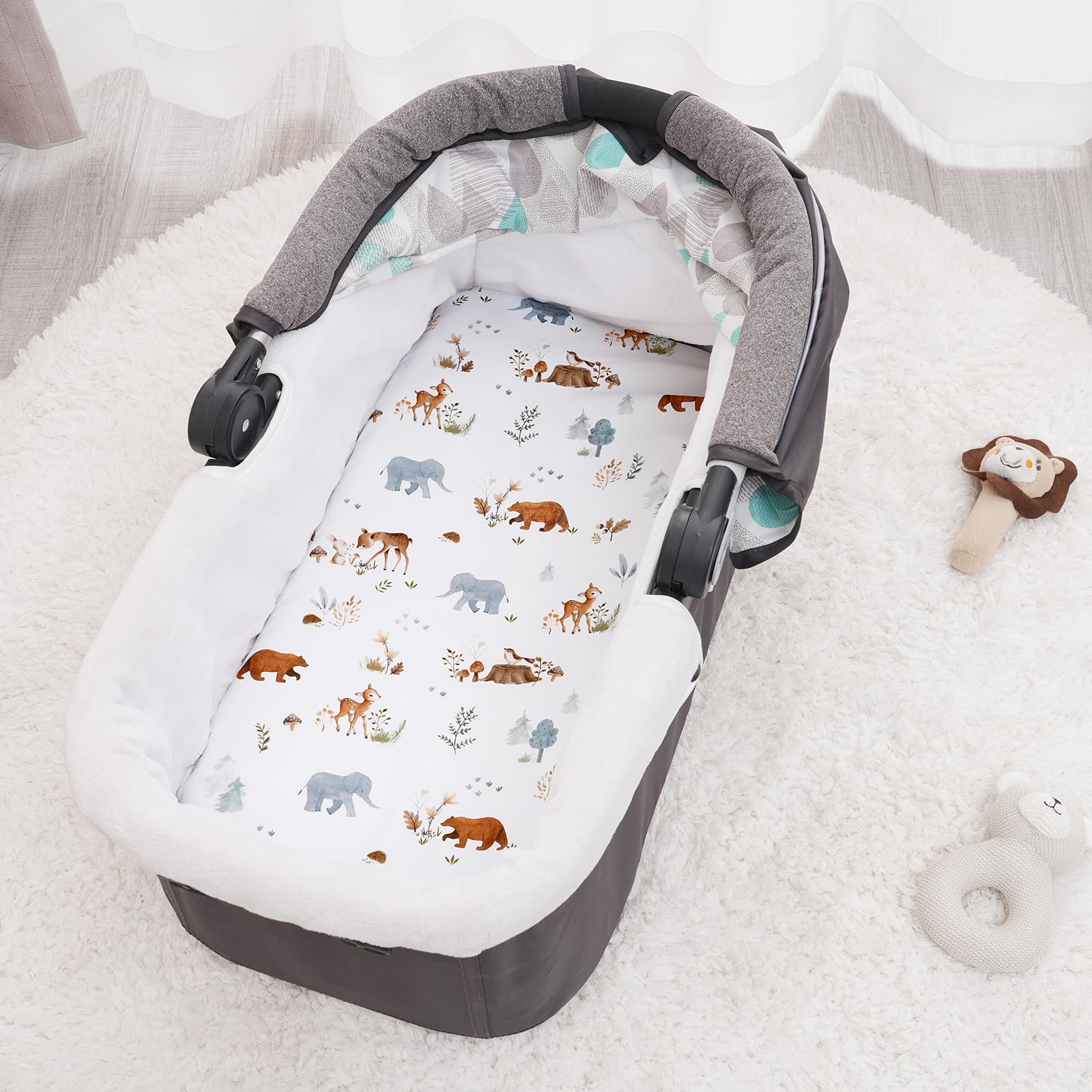 2 Pack Bassinet Sheets: Pack of 2 bassinet crib sheets are designed with classic, adorable and stylish woodland. These sheets are fun without being to childish, they are soft and fit great. With these patterns, you can teach your baby to recognize these woodland.You can use it as your baby photo background, too. I believe, such a background will make your baby more popular.