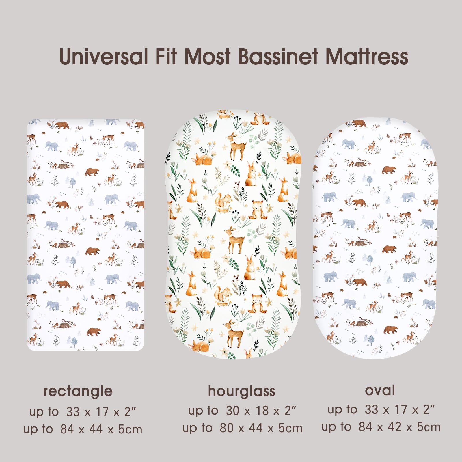 Perfectly Fit: Measuring 17 by 32 inches with 5 inches pocket, Our bassinet sheets fit almost all standard oval, round, rectangle, hourglass shaped bassinet mattress. A whole strong elastic band at the bottom help keep the sheet stay flat right in place securely and snugly to create a safe and comfortable sleep environment for babies.