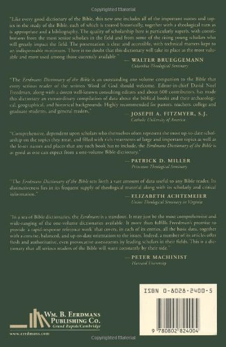 The Eerdmans Dictionary of the Bible gathers nearly 5,000 alphabetically ordered articles that thoroughly yet clearly explain all the books, persons, places, and significant terms found in the Bible. The Dictionary also explores the background of each biblical book and related writings and discusses cultural, natural, geographical, and literary phenomena--matters that Bible students at all levels may encounter in reading or discussion. Nearly 600 first-rate Bible authorities have contributed to the Eerdmans Dictionary of the Bible. Intended as a tool for practical Bible use, this illustrated dictionary reflects recent archaeological discoveries and the breadth of current biblical scholarship, including insights from critical analysis of literary, historical, sociological, and other methodological issues. The editorial team has also incorporated articles that explore and interpret important focuses of biblical theology, text and transmission, Near Eastern archaeology, extrabiblical writings, and pertinent ecclesiastical traditions--all of which help make the Eerdmans Dictionary of the Bible the most comprehensive and up-to-date one-volume Bible dictionary on the market today.