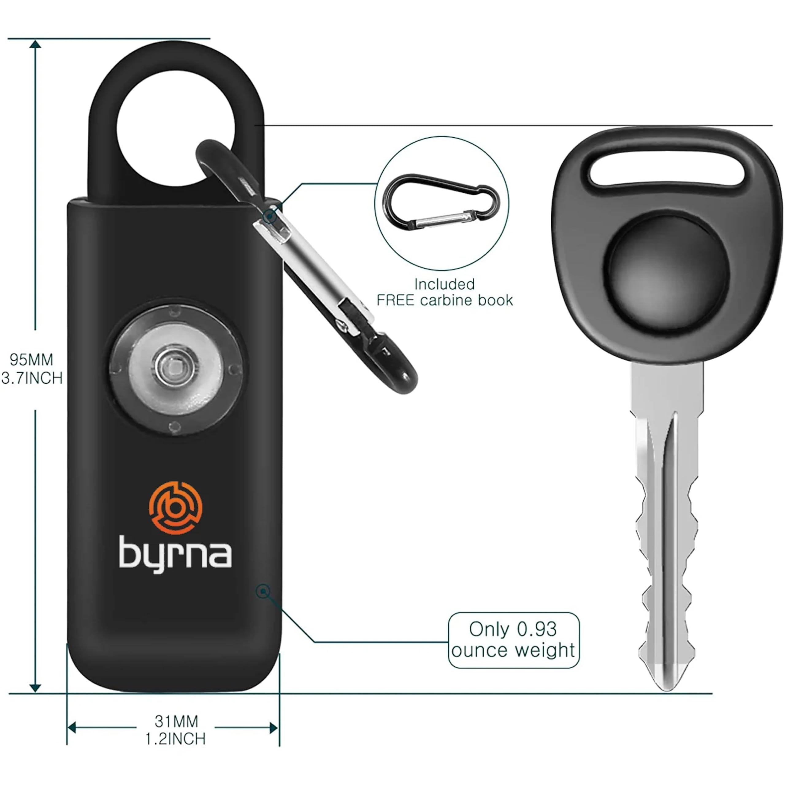 WHAT'S IN THE BOX: (1) Byrna Banshee 130dB Personal Safety Alarm, (1) Carabiner to attach Byrna Banshee.