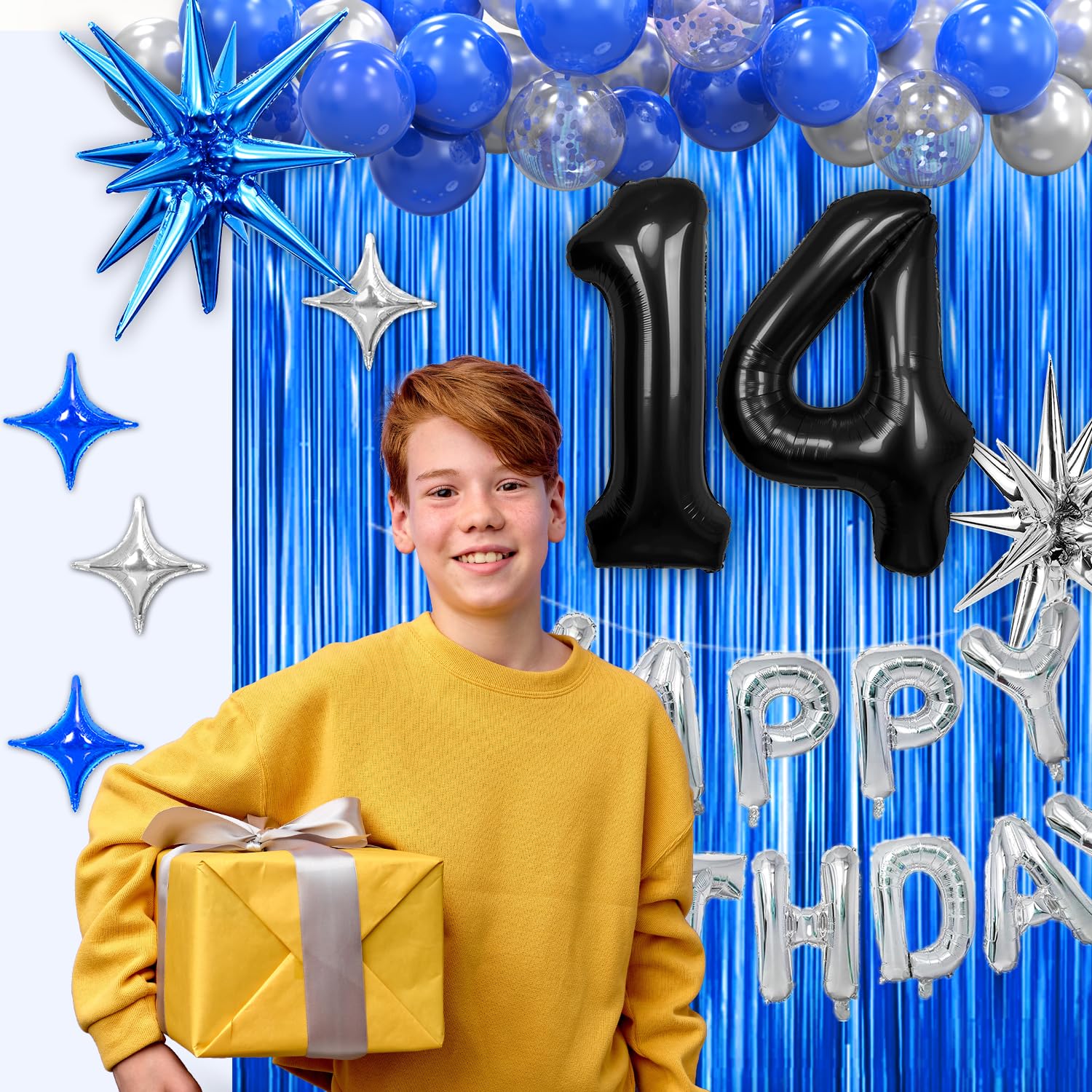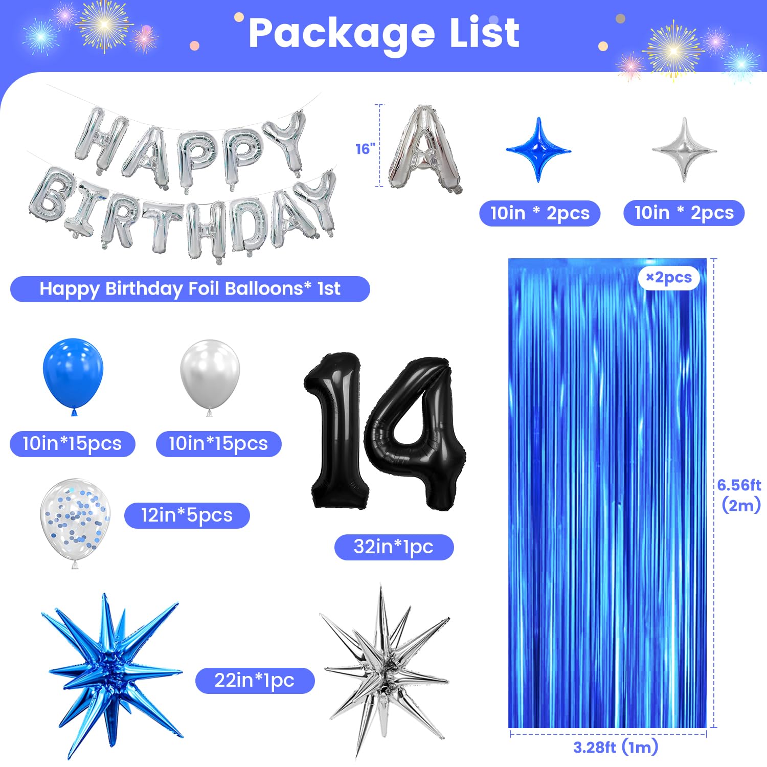 đ”ăWhat You Will Get?ă- You will get 1set Happy Birthday letter Balloons(16inch),2pcs Blue Foil Fringe Curtains (6.5*3.3ft each), 2pcs Explosion Star Foil Balloons(22inch),2pcs Blue/Silvery Star Foil Balloons(10inch), 35pcs Latex Balloons, Number 14 Foil Balloons(32inch)