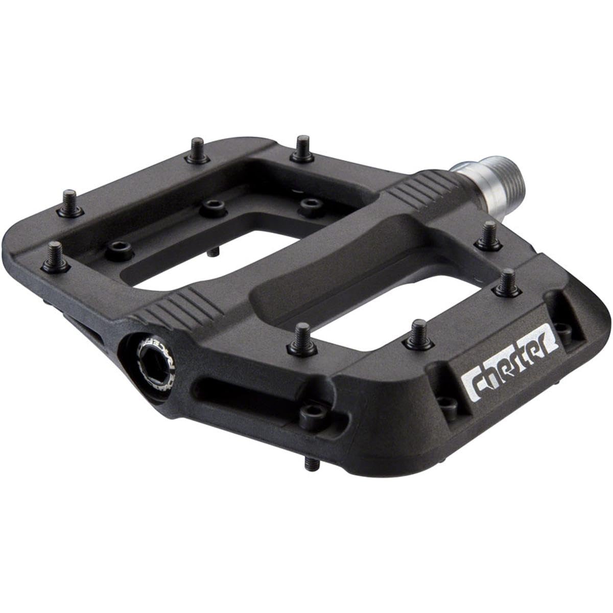 A new edition to the Race Face pedal line-up: the Chester Pedal. The tough and burly nylon composite body provides a large platform with the same grip as traditional alloy pedals via the bottom loading 8 hex traction pins per side. Thin and lightweight is the name of the game with the Chester, featuring a cro-mo axle that is fully sealed and a 100% serviceable bearing and bushing system. This pedal offers great performance for a wide range of riders at a price that leaves plenty of cash in your pocket for that round of bevies at your local watering hole after hammering out a day of hot laps with the crew. FEATURES Nylon composite body Replaceable steel pins (8 per side) Fully sealed Serviceable Smooth and durable sealed bearing and bushing system Cro-mo axle Thin and lightweight concave platform Large platform with same grip as traditional pedals.