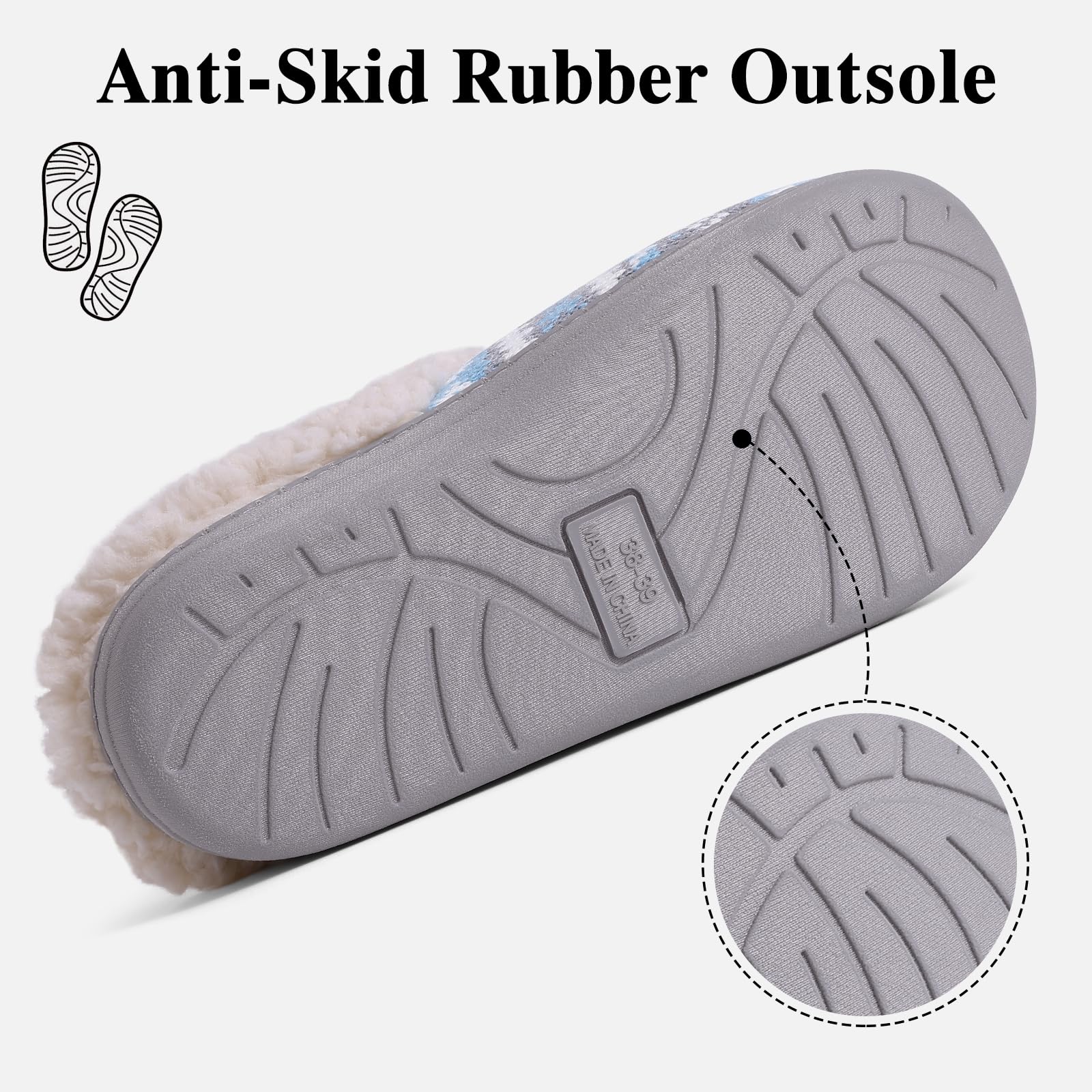 𝐈𝐧𝐝𝐨𝐨𝐫 & 𝐎𝐮𝐭𝐝𝐨𝐨𝐫: Durable waterproof rubber soles make these womens slippers great for indoor and outdoor use. Anti-skid texture in the bottom and no-slip fluffy lining gives you safe and secure footing.