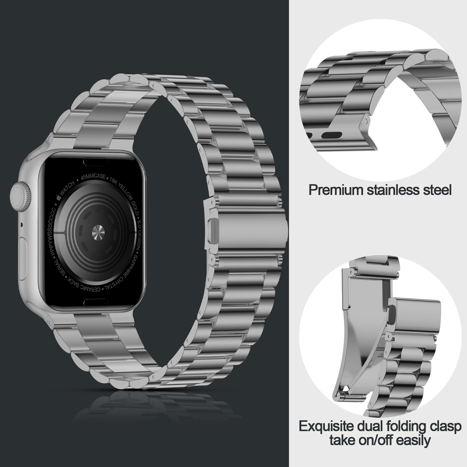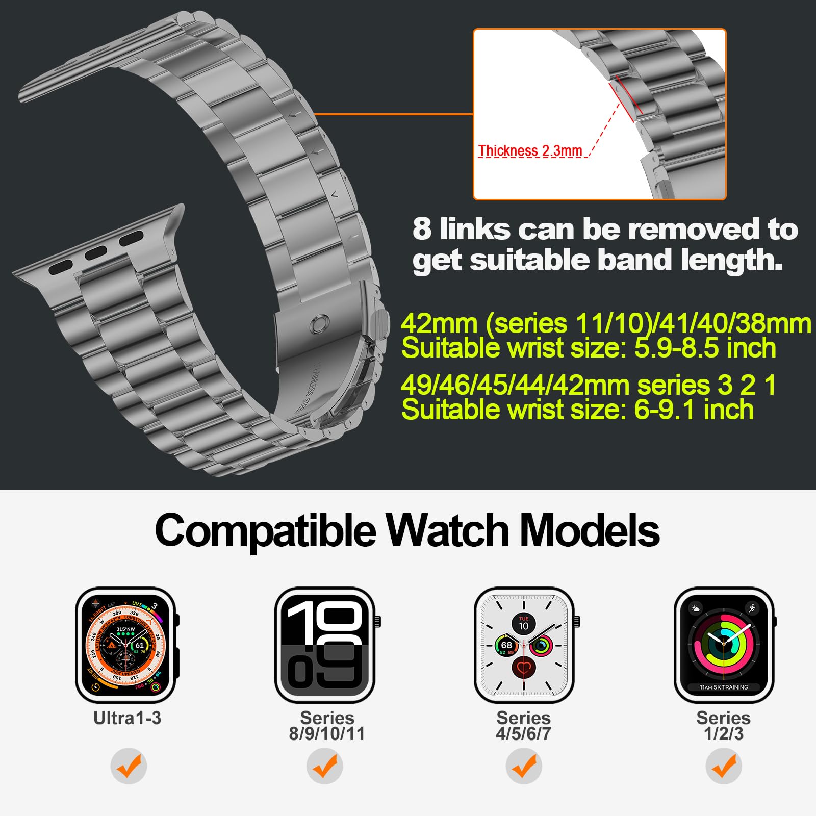 Compatible with Multiple Sizes: This premium stainless steel band fits Apple Watch 46mm series 11/10, 49mm Ultra 3/Ultra 2/Ultra, 45mm Series 9/8/7, 44mm SE3/SE2/SE Series 6/5/4, and 42mm Series 3/2/1, covering all editions. Note: the space gray color is same as the gray iWatch Series 11 .