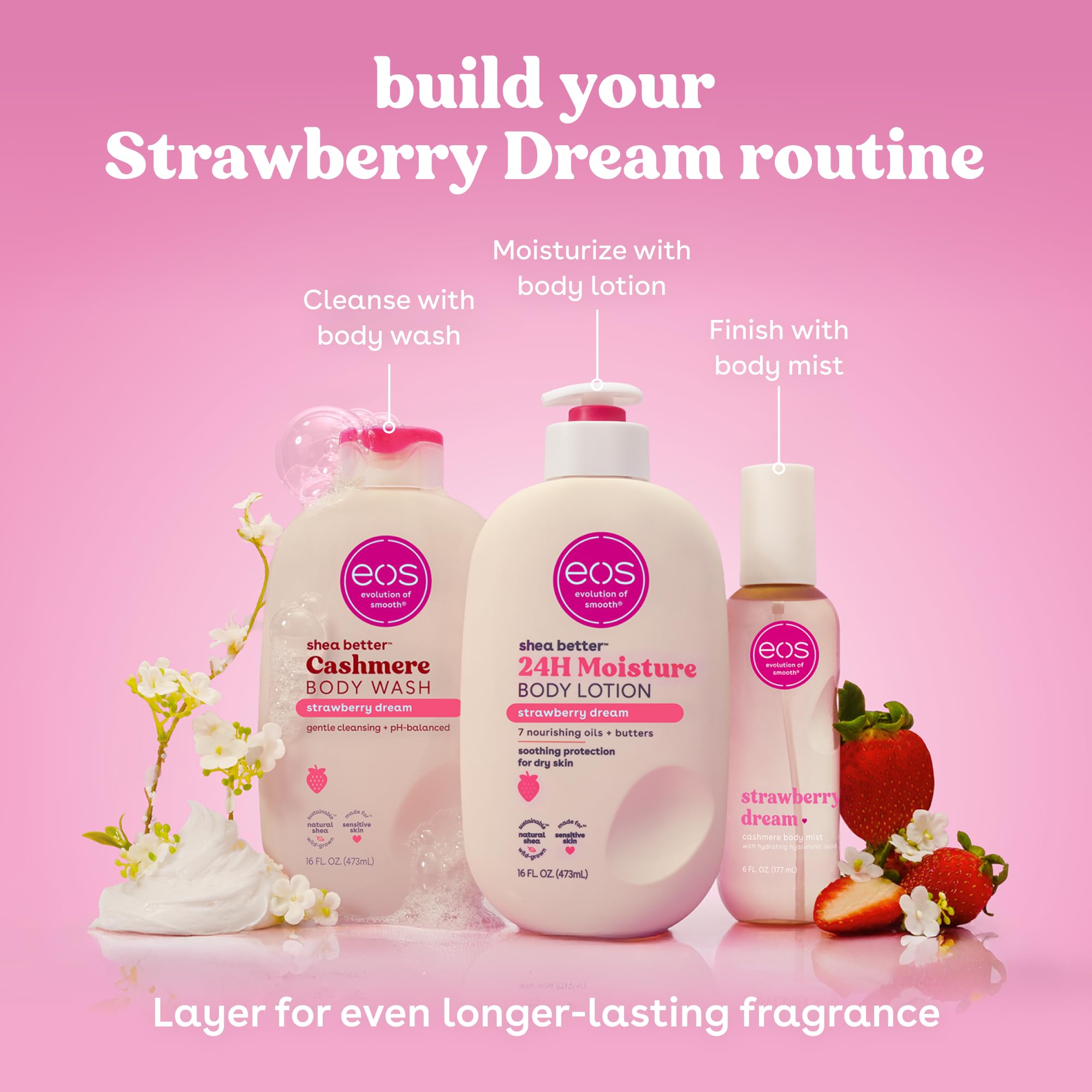 eos STRAWBERRY DREAM BODY LOTION: Liberally apply eos lotion to just-cleaned skin - we'll do the rest. Pro tip: Layer this with your favorite fragrance for an enhanced experience