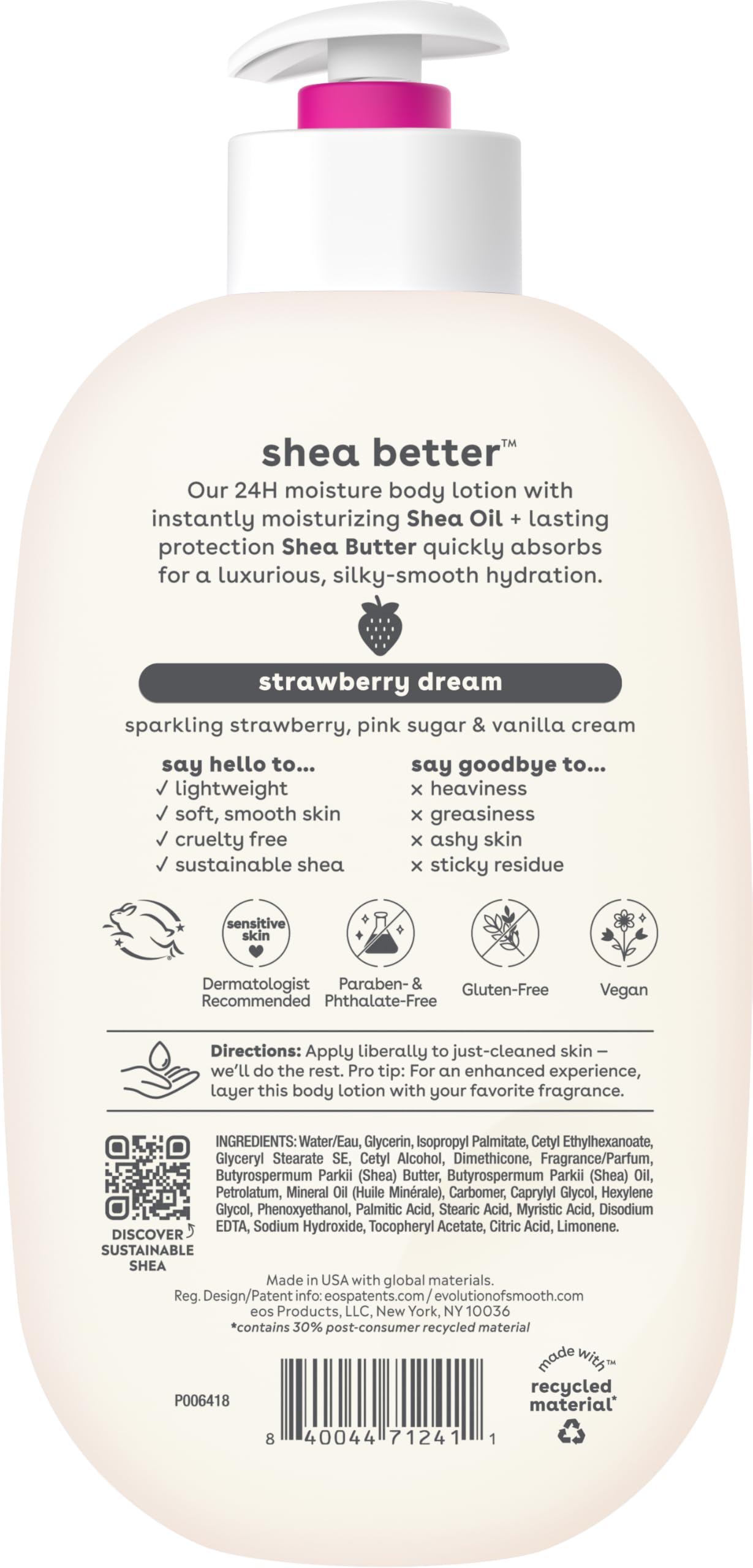 Our delightful Strawberry Dream shea butter lotion for women features notes of sparkling strawberry, blended with pink sugar and vanilla cream to take you to sweet and dreamy places. eos 24 hour moisture body lotion with instantly moisturizing Shea Oil + lasting protection Shea Butter quickly absorbs for 24-hour hydration. Say hello to fast-absorption, lightweight, soft skin, and sustainable shea. Say goodbye to body lotions with greasiness, heaviness, and sticky residue. Enjoy the soothing benefits of this moisturizing lotion, exquisitely designed for lightweight, non-greasy, fast-absorbing application.