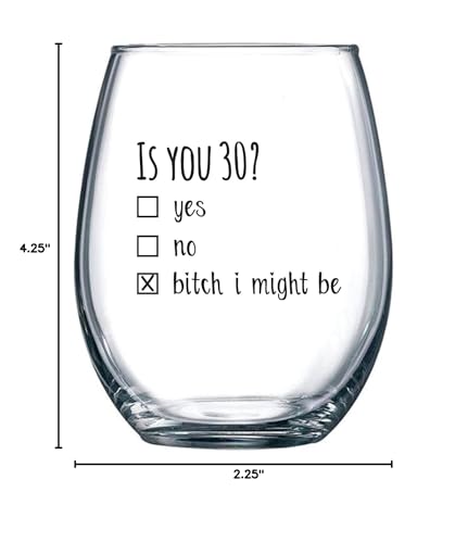 Ever ask yourself "I need a perfect gift that lets my loved one know how special they are?" This wine glass is the perfect choice for their special birthday! WINE LOVER? WINE ENTHUSIAST? OCCASIONAL WINE DRINKER? The wine glass makes drinking your favorite wine, red or white, vino, spirits, or adult beverage lol funny guaranteed! An affordable wine gift solution: Thinking of a unique gift idea can be daunting task. The Is You 30 wine glass gift is an inexpensive present or wine accessory for any wine lover or enthusiast (men or women):
