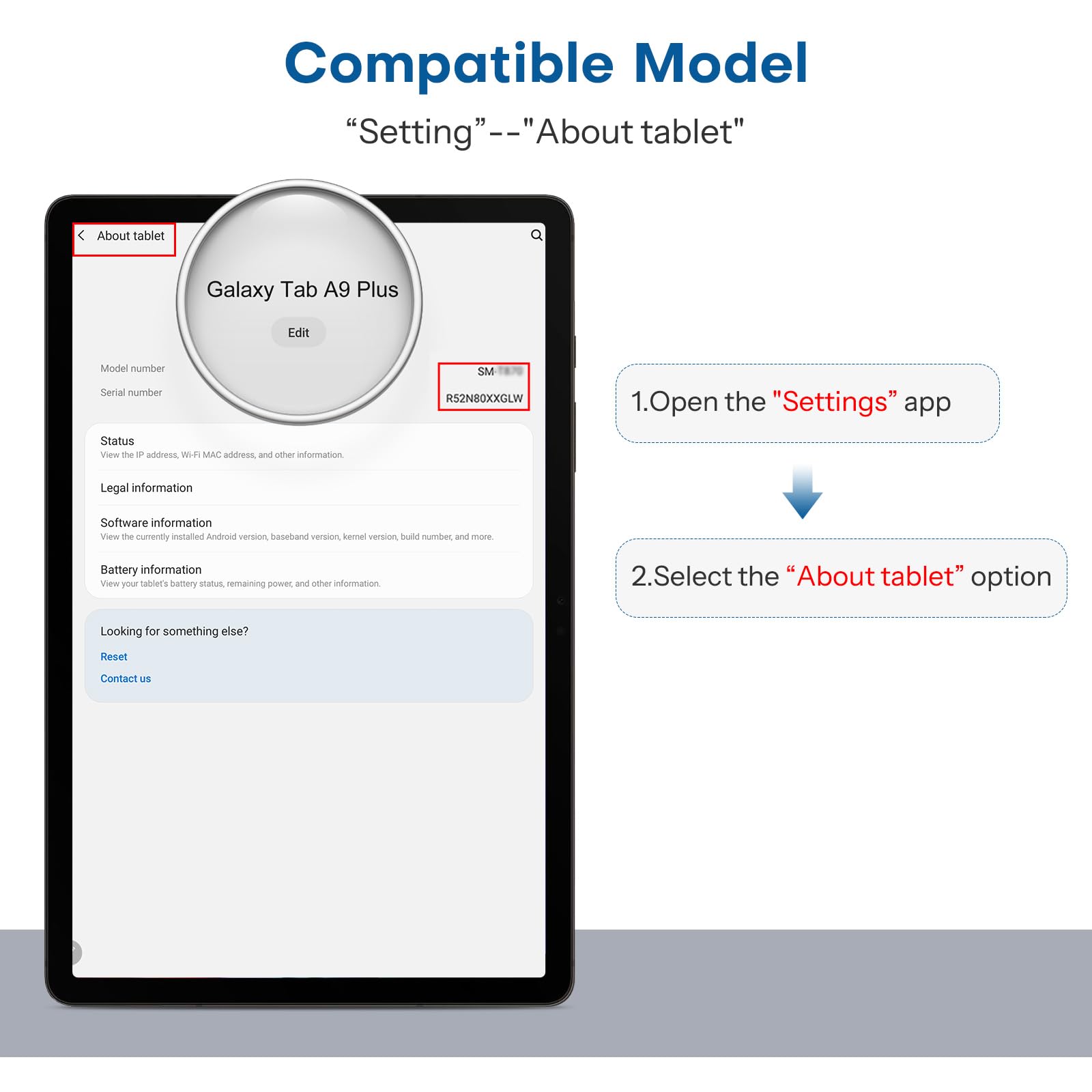 Confirm Model Number: Only design for Samsung Galaxy Tab A9 Plus 5G 11 Inch ( model number: SM-X210, SM-X216, SM-X218). Please check the model number on your tablet before purchasing: ①"Setting"; ②"About tablet"
