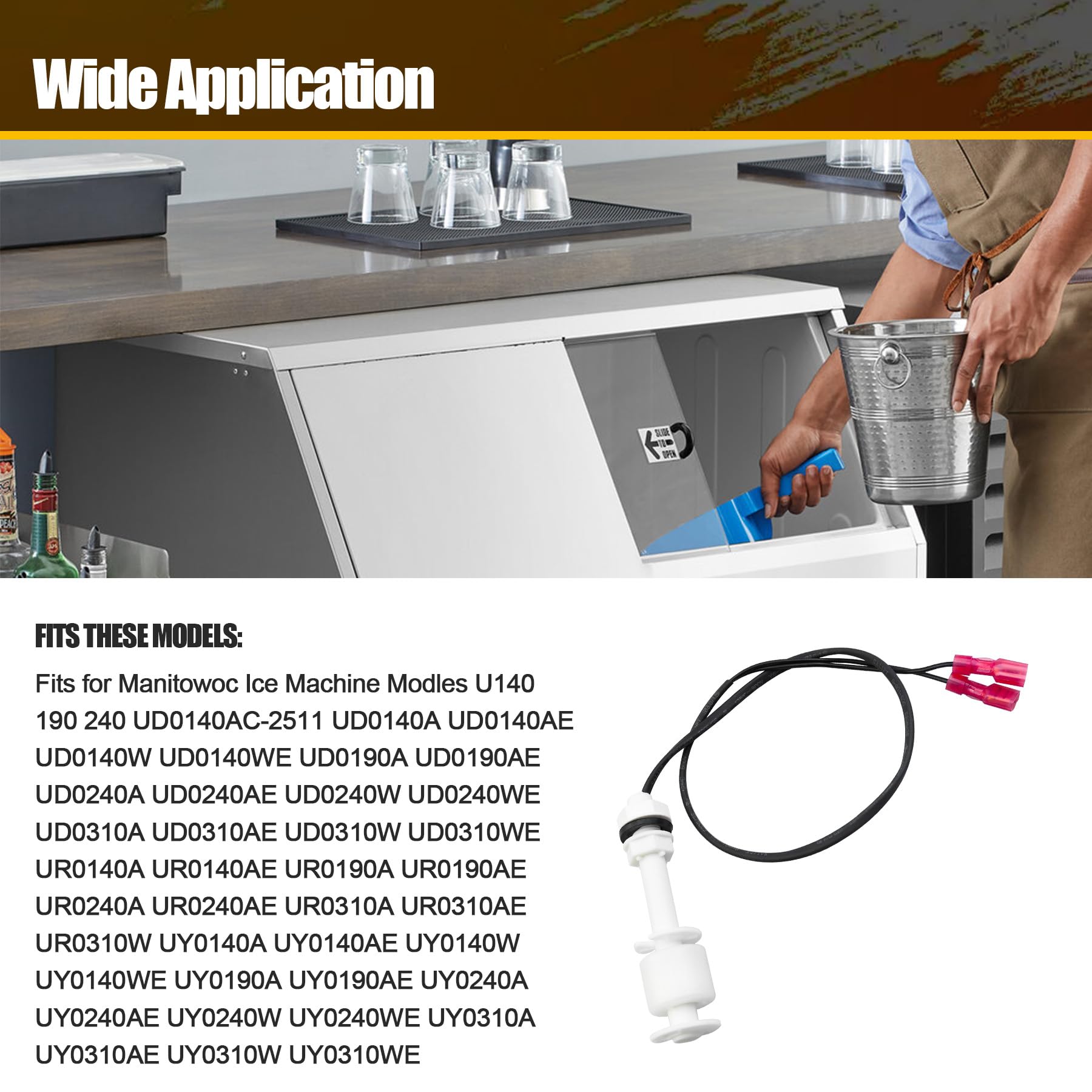 Compatibility: 040001783 ice thickness float switch is fit for Manitowoc ice machine models U140 190 240 UD0140AC-2511 UD0140A UD0140AE UD0140W UD0140WE UD0190A UD0190AE UD0240A UD0240AE UD0240W UD0240WE UD0310A UD0310AE UD0310W, and more
