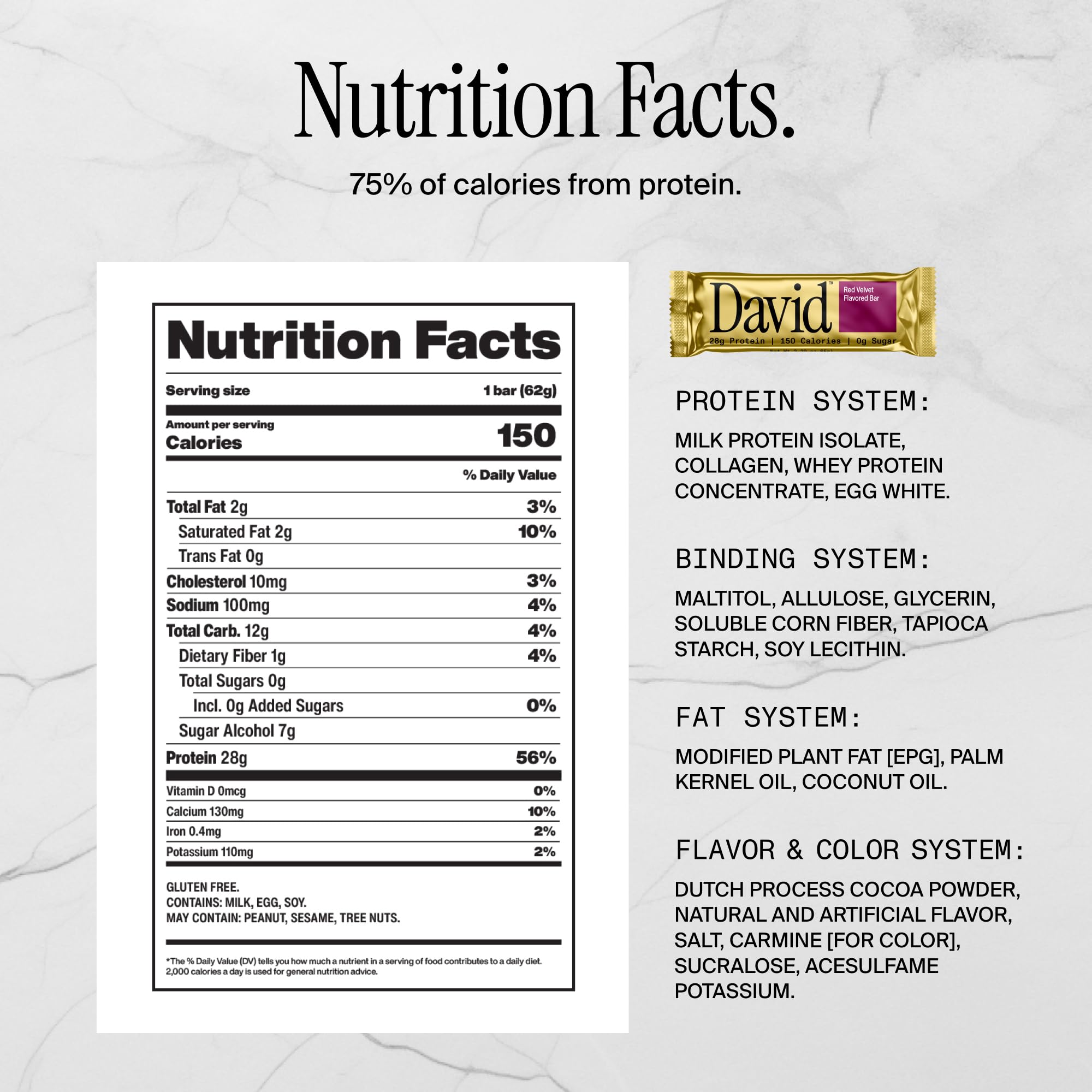 DELICIOUS FLAVOR OPTIONS – Red Velvet David protein bars taste like a rich blend of vanilla and chocolate cake batter with vanilla buttercream frosting. It is sweet with white chocolate chunks and vanilla cookie crisps. With the David Flavor System, you get all the sweetness without added sugar. These low carb protein bars have a creamy texture with added crunchy crisps. Key components of the flavor system are cocoa powder, natural & artificial flavors, salt, sucralose, & acesulfame potassium.