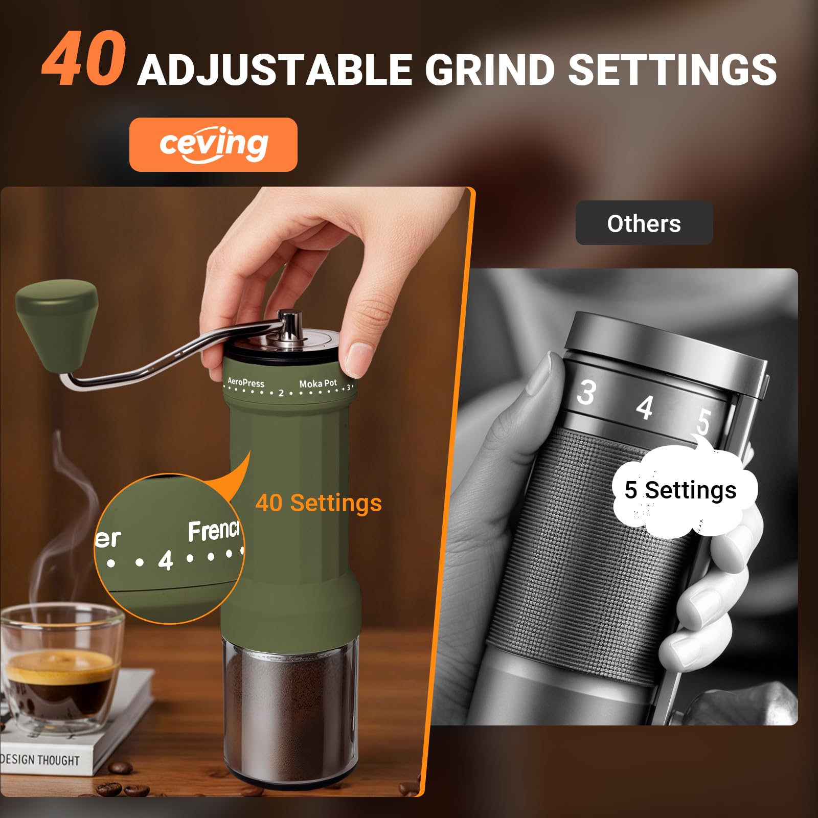 40 EXTERNAL ADJUSTABLE GRIND SETTINGS – Unlike traditional grinders with hidden internal adjustments, our manual coffee mill features 40 precise external settings for effortless fine-tuning. Simply turn the dial to switch from espresso-fine to French press-coarse—no guesswork, no messy spills. Enjoy full control over your grind for richer flavor in every cup!