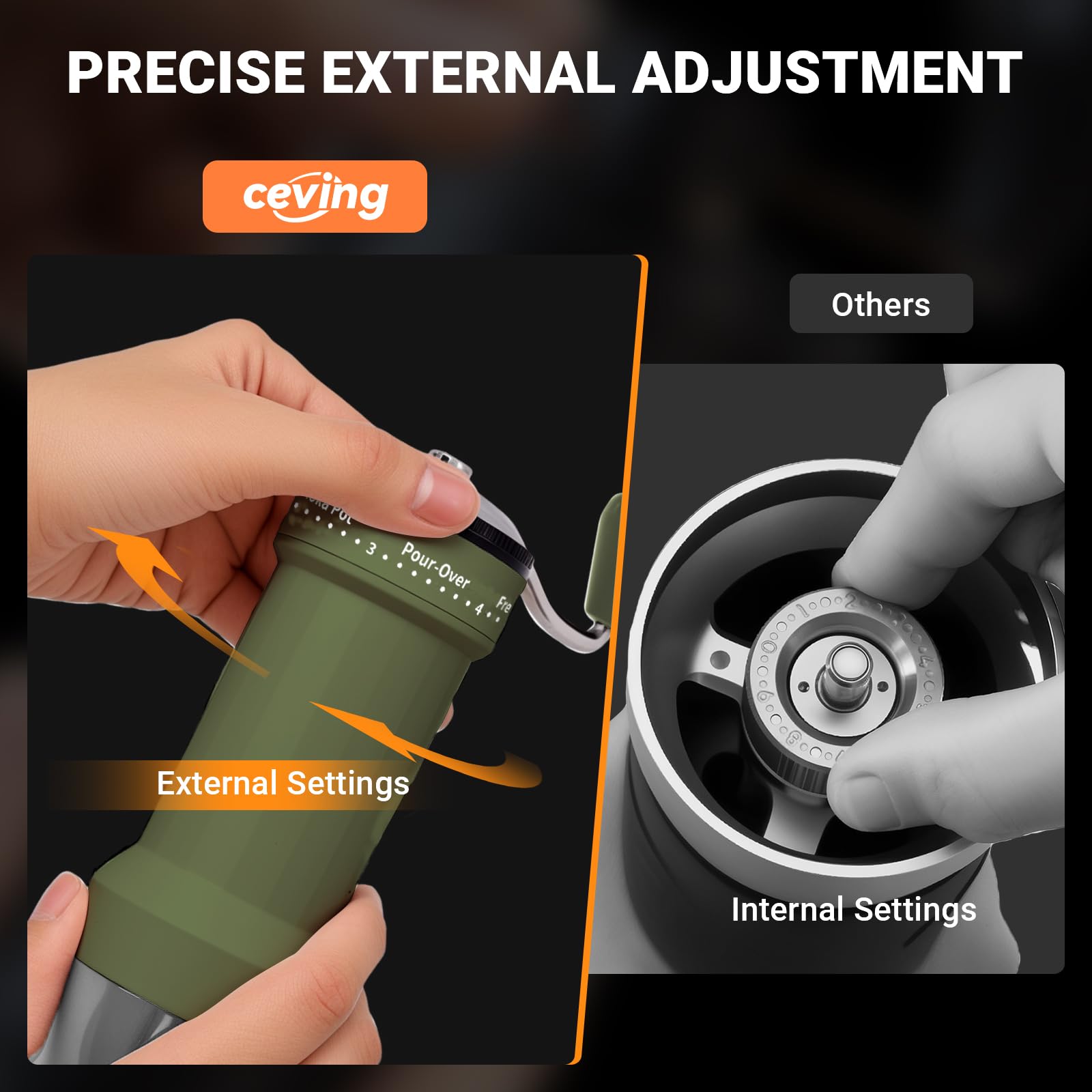 REDEFINING COFFEE GRINDING - As a rising star in the coffee grinder market, CEVING is revolutionizing coffee grinding with our innovative external grind-size adjustment system. As an industry leader in this field, we're dedicated to providing coffee lovers with precise, convenient grinding solutions to unlock the perfect flavor in every cup.